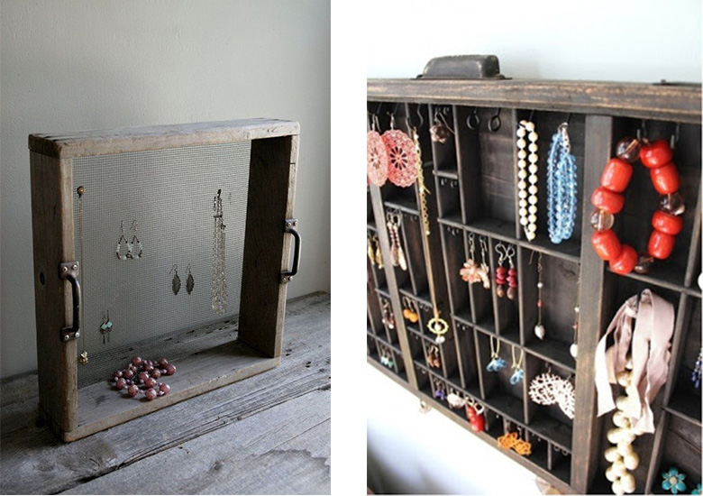 Toujours dans cette idée de détournement, les tiroirs de meubles anciens peuvent être utilisés pour ranger vos bijoux ! On ôte le fond pour le remplacer par un fin grillage à poule comme dans le premier exemple, ou, lorsqu’il s’agit d’un tiroir d’imprimerie ou de mercerie, on utilise les compartiments.