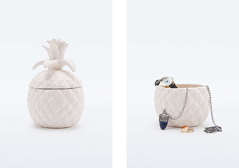 Pour les adeptes des ambiances épurées, on peut aussi opter pour la boite à bijoux fermée, comme cette jolie boite en forme d’ananas !