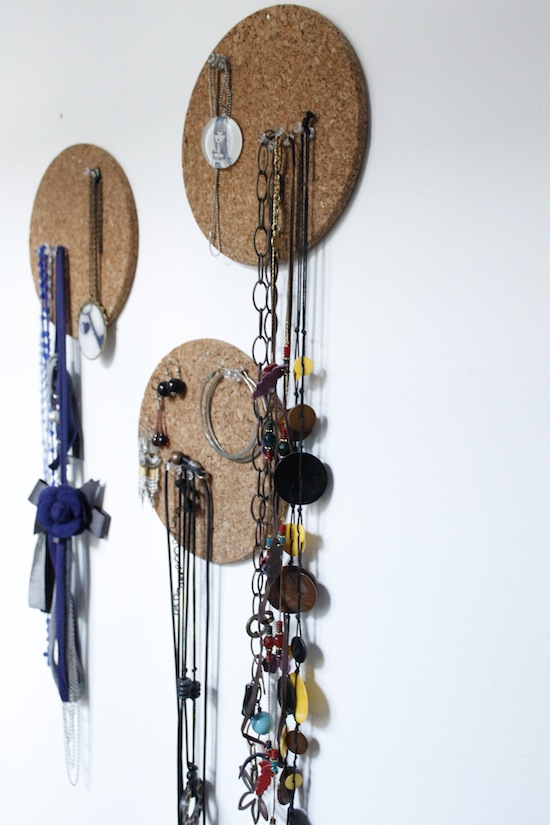 Pour finir, une idée simplissime et économique, que je trouve assez graphique ! on accroche simplement des ronds de liège au mur et on vient y planter directement ses boucles d’oreilles ou ses colliers à l’aide de jolies punaises. Vous pouvez aussi peindre le liège !