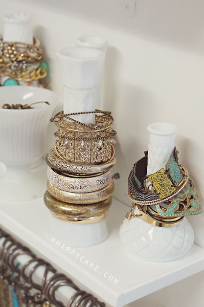 Les idées pour ranger ses bijoux se trouvent aussi dans l’upcycling, la preuve avec cette idée que j’aime beaucoup de vases peints en blanc autour desquels on empile des bracelets.