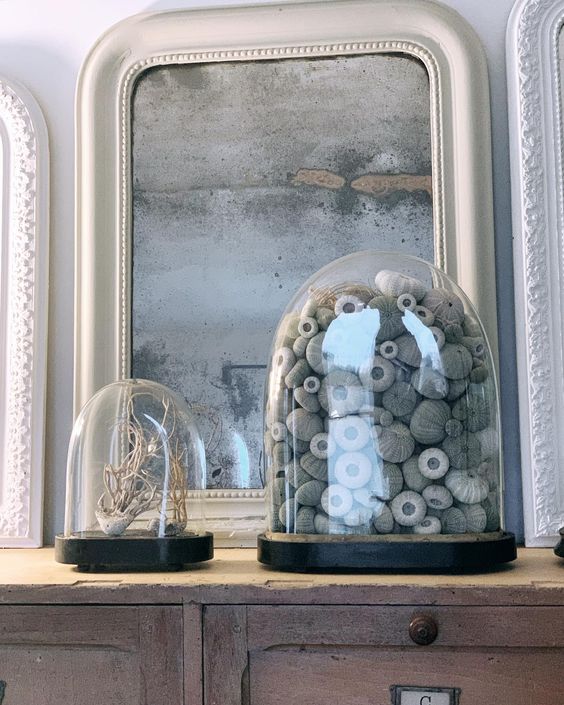 Coquillages ramassées sur la plage des vacances, ticket de concert, faire-part de mariage… les objets symboles de beaux moments sont nombreux ! Si vous aimez les collecter, pourquoi ne pas les exposer dans une jolie boite en verre ? Les globes de mariées anciens ou les cloches en verre sont également de merveilleux écrins.