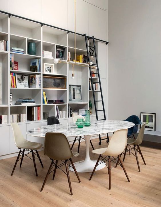 Des rangements suffisants et adaptés, voilà peut-être LA clef pour aménager et décorer une pièce, quelle qu’elle soit. La salle à manger n’y échappe pas ! Buffet classique, vitrine, mais aussi bibliothèque seront parfaits pour ranger les éléments propres à cette zone telle que la vaisselle, tout en mettant en scène vos objets déco préférés.