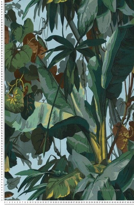 Dans un esprit années 60, ce joli camaieu de vert et bleu avec des pointes d’ocre nous emmène dans les buissons d’une véritable forêt tropicale. Ce papier peint de caractère invite au voyage et nous transporte ailleurs ! Dessiné par A.S création, il se retrouve chez différents distributeurs, je vous l’ai dégoté chez papiers peints direct au prix de 22,46 euros le rouleau.