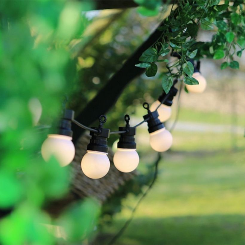 1.lanterne métal et verre pour bougie, 49.90 euros / 2.lanterne extérieure rechargeable, 79.90 euros / 3.guirlande guingette extérieure 10 ampoules; 39.90 euros/ 4. deux boules lumineuses d’extérieur solaire, à piquer ou poser; 39.90 euros