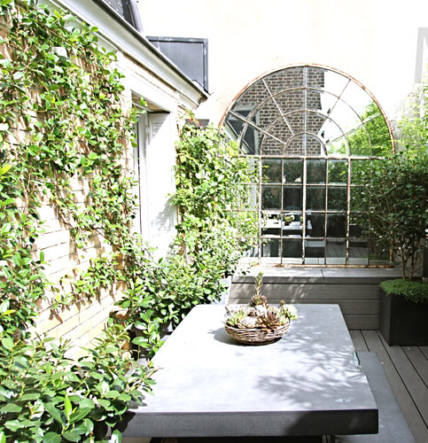 - un miroir sur la terrasse : que ce soit un grand miroir façon verrière ou une accumulation, j’adore l’idée d’amener cet objet jusqu’à l’extérieur. Il créé des jeux de perspective mais il permet aussi d’amener la lumière dans un coin d’ombre.