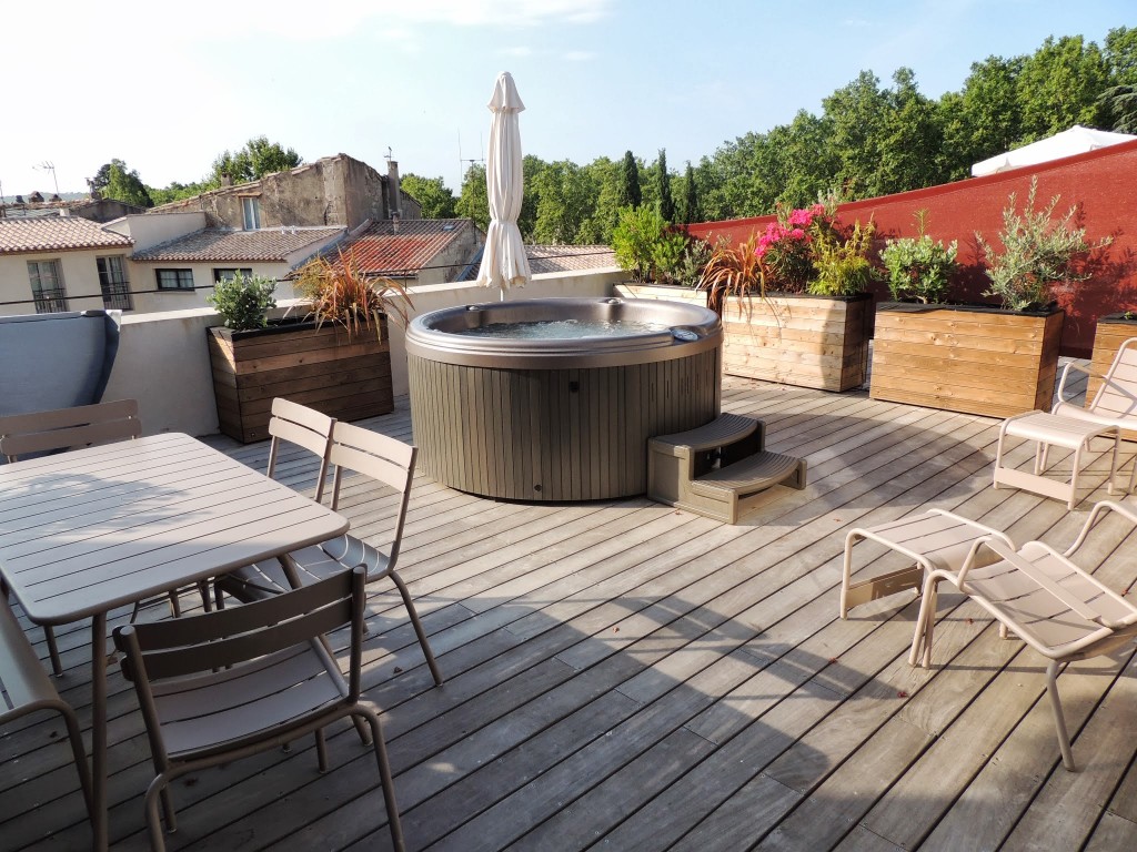 - une végétation luxuriante : pour peu qu’on ait la main verte, on hésite pas à transformer sa terrasse en véritable forêt, à coup de grands arbustes et de plantes foisonnantes !