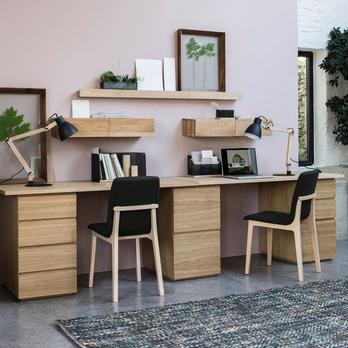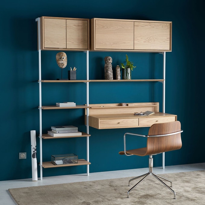 Les modules de rangements sont également très pratiques et s’adaptent à toutes les contraintes d’espaces. Vous pouvez ainsi combiner ces cubes en chêne comme vous le souhaitez, et les faire évoluer facilement ! Pour transformer un rangement ouvert en rangement fermé, pensez aux cubes en tissu : pratique pour y glisser les classeurs !