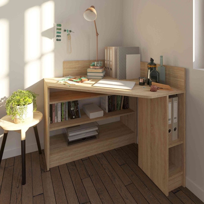 Si la taille ou la configuration de la pièce la rend problématique à aménager, pensez au bureau d’angle : il permet d’exploiter les pièces carrées notamment en maximisant la surface de travail. Sa grande profondeur centrale est également très pratique pour les écrans imposants. Et pour les mini chambres, le bureau mural a tout bon : fermé il ne prend aucune place !