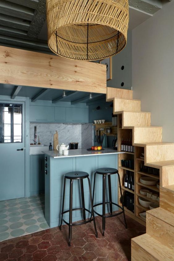 - Créer une unité dans la décoration : unifier au maximum les sols et les murs. Oser la couleur donnera du caractère à votre studio. Veillez toutefois à l’employer de manière astucieuse, comme dans cette réalisation de Marianne Evennou qui utilise le bleu sur les meubles de cuisine mais aussi les murs et même les plafonds pour unifier l’espace.