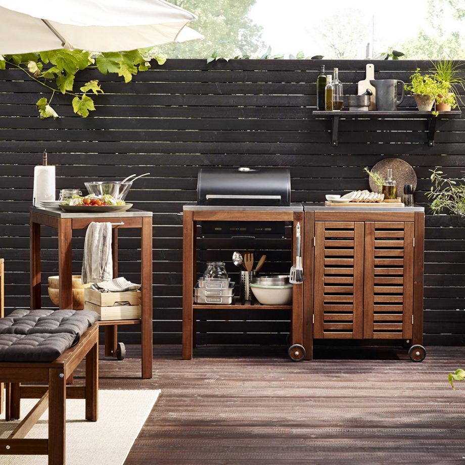Les fabricants de mobilier de jardin proposent aujourd’hui de nombreux modèles de desserte à roulette pour une cuisine d’été nomade ! En inox ou en bois traité, elles se nettoient facilement et permettent d‘installer une plancha ou un barbecue, mais aussi d’offrir un espace plan de travail et rangement. Ces chariots offrent le grand avantage de se déplacer facilement et de prendre peu de place. Malin non?