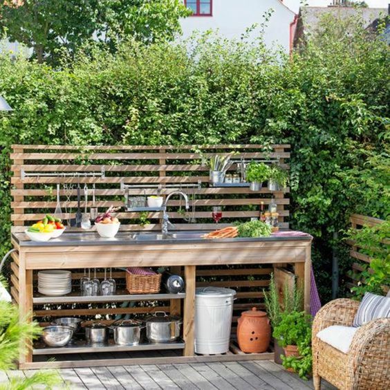 J’aime beaucoup l’idée du claustra bois dans une cuisine d’été. Il permet de délimiter la zone concernée et de s’isoler des regards. C’est aussi un excellent moyen d’ajouter des rangements en l’utilisant pour y suspendre des accessoires !