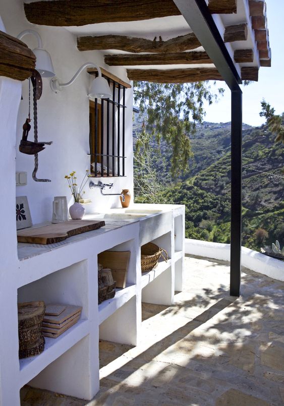 Dans cet article, j’ai eu envie de vous proposer des solutions ne nécessitant pas de travaux ni de gros budgets. Mais je ne pouvais pas ne pas mentionner la traditionnelle cuisine d’été maçonnée. Si vous êtes bricoleurs, pourquoi ne pas vous lancer dans la confection d’un plan de travail en dur ? Le béton coffré ou les carreaux de Siporex sont les matériaux les plus adaptés ce type d’ouvrage, et ont l’avantage de s’intégrer aux murs de votre maison. Attention, de part leur caractère définitif, les éléments maçonnés sont à réserver aux propriétaires. Vous ne souhaitez pas vous lancer dans un grand chantier ? Bonne nouvelle, il existe des alternatives plus accessibles et tout aussi jolies et pratiques !