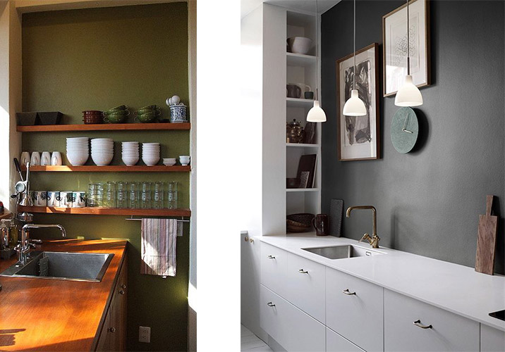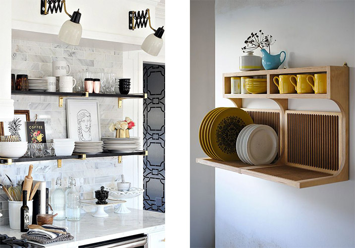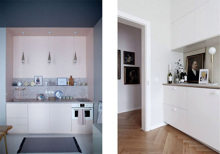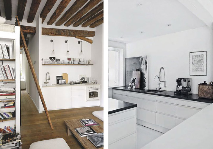 - on désencombre visuellement l’espace! Les robots, les accessoires, les épices… tout ceci prend de la place, rogne sur l’espace libre du plan de travail et surcharge visuellement l’espace. Lorsqu’on aménage une petite cuisine, on pense donc désencombrement maximum en suspendant les accessoires qui nécessitent d’être toujours à portée de main ou en fixant l’égouttoir à vaisselle au mur par exemple, et en misant sur les rangements fermés pour cacher un maximum de choses.