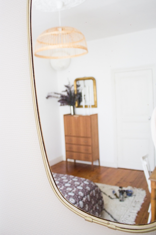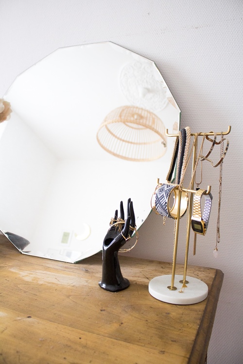 Du côté de la table ancienne qui me sert de coiffeuse, une petite vitrine en laiton est venue se poser sur le mur pour accueillir quelques bijoux, et une main en céramique chinée elle aussi est parfaite pour ranger les bagues ! Et puis j’ai aussi acheté un porte bijoux en marbre et métal doré, super pratique pour suspendre les colliers ! La chaise aussi à changé, pour une Baumann chinée et rénovée. En parlant de chine, j’ai installé ce miroir rétroviseur des années 70 à côté de la fenêtre, j’adore leur forme organique !