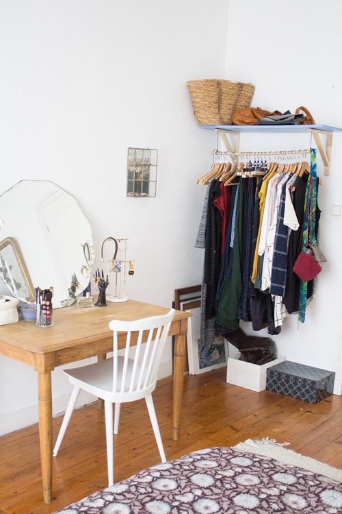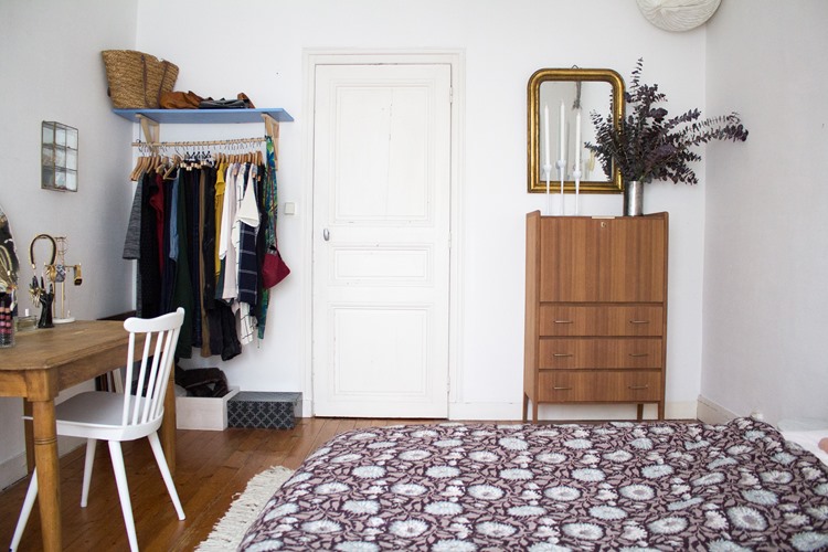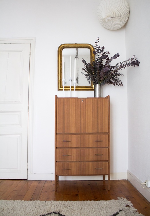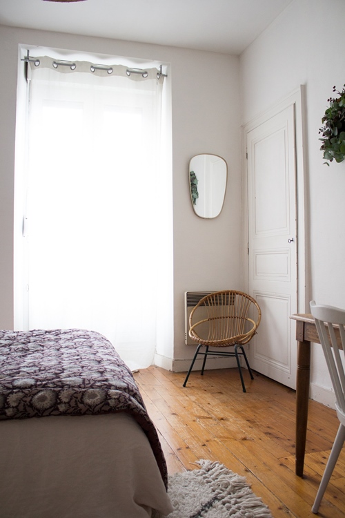 Cela fait longtemps que je ne vous ai pas emmené dans la chambre ! Il y a eu plusieurs changements depuis la dernière fois, mais cela reste toujours dans un esprit plutôt épuré, une pièce qui m’apaise et me détend. La principale nouveauté, c’est ce secrétaire que j’avais chiné pour la boutique. Ca vous est déjà arrivé d’avoir un coup de foudre que vous n’arrivez pas vraiment à vous expliquer pour un meuble ou un objet ? C’est le cas pour moi avec ce secrétaire, qui, si il n’est objectivement pas la pièce la plus jolie qui est passée dans l’atelier, est un meuble que j’ai tout de suite adoré. Je ne sais pas si ce sont ses longs pieds fuselés ou ce plaquage en noisetier que j’ai découvert lors de la rénovation sous les épaisses couches de teinture et de vernis, toujours est-il que j’ai eu beau lutter pour ne pas le garder, je n’avais pas fini la rénovation que je savais déjà au fond que je n’arriverais pas à m’en séparer. J’ai donc viré la commode ikea, hyper pratique certes mais sans aucun charme, et sa place était toute trouvée ! Le dressing ouvert suspendu n’a lui pas bougé, je l’aime toujours autant (vous pouvez retrouver le DIY simplissime ici )