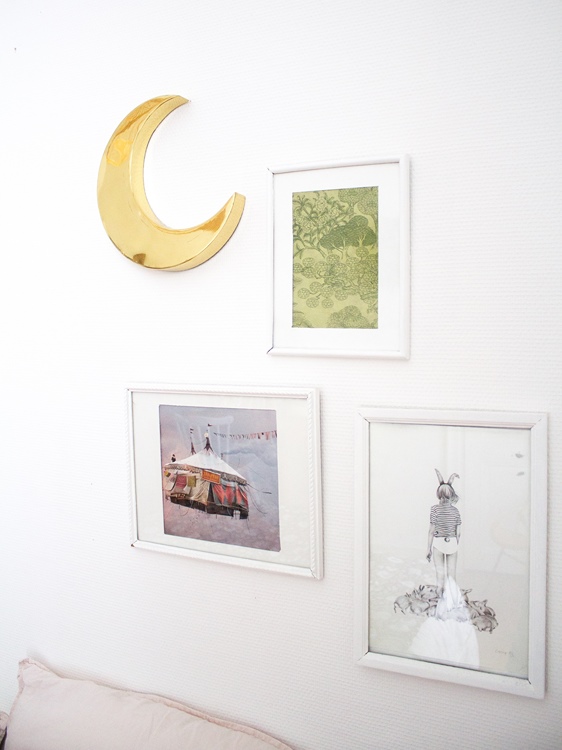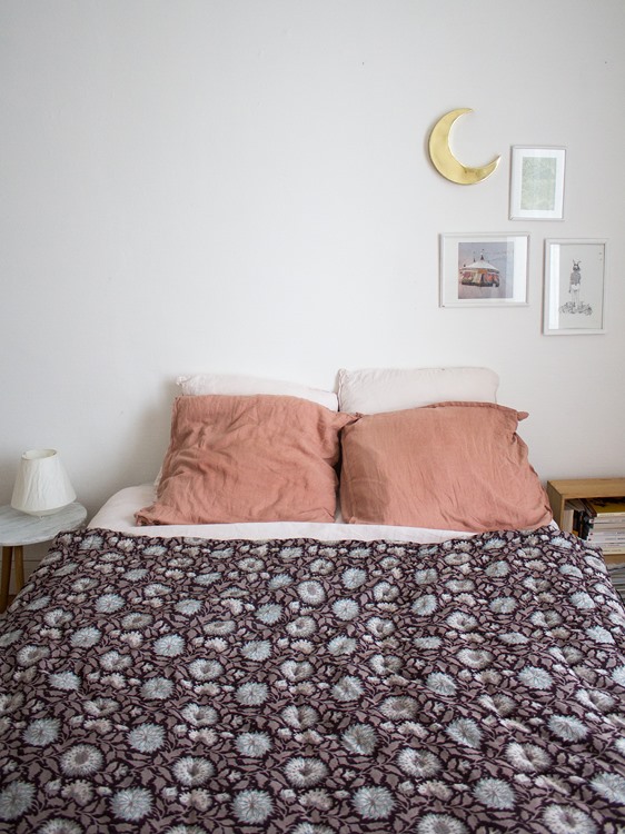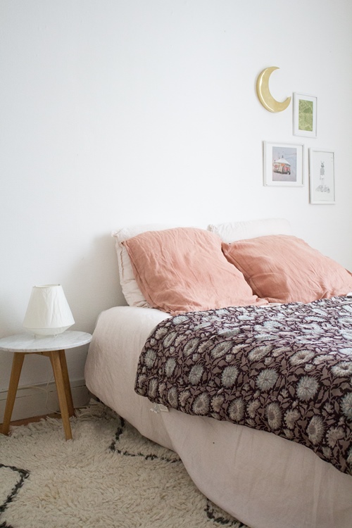 Sur le lit, un couvre lit trouvé chez AMPM, je ne me lasse pas de ses motifs végétals. Le tapis du salon a migré dans la chambre (car il y a pas mal de changements aussi dans l’autre pièce, je vous montre tout cela très bientôt!), j’ai aussi accroché une lune trouvée chez les petits bohèmes au dessus du lit, je cherche maintenant de jolies appliques lumineuses pour parfaire ce petit coin.