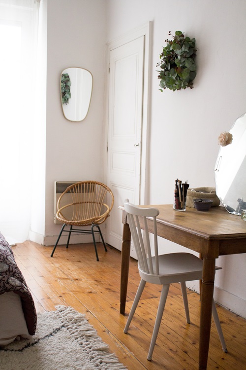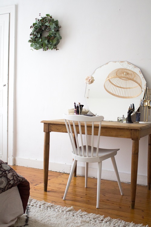 J’aime beaucoup les détails comme ce petit bureau et sa chaise blanche, le miroir doré et la suspension ! sans oublier le joli bouquet !