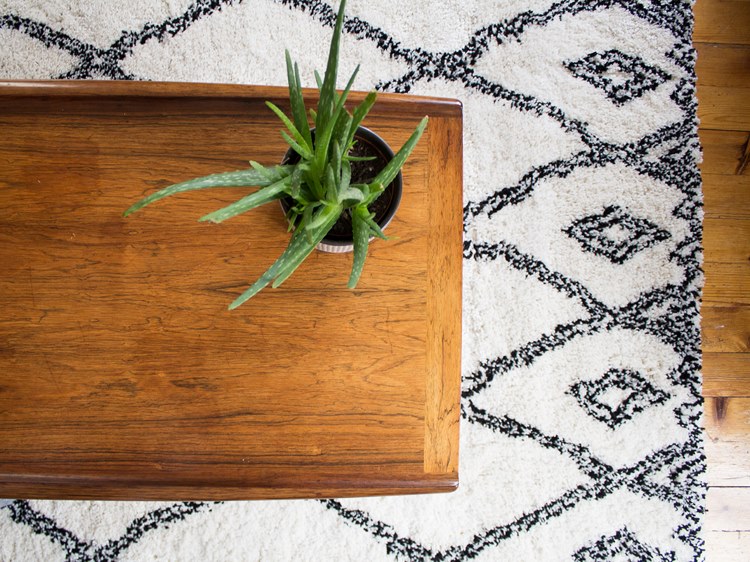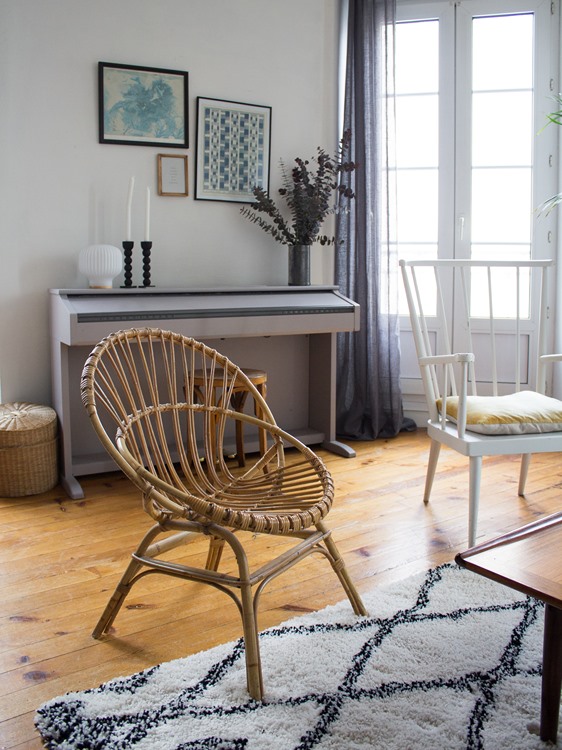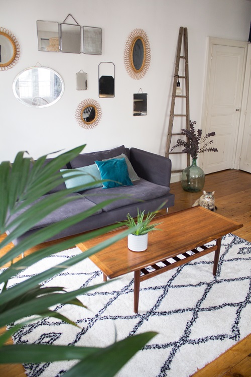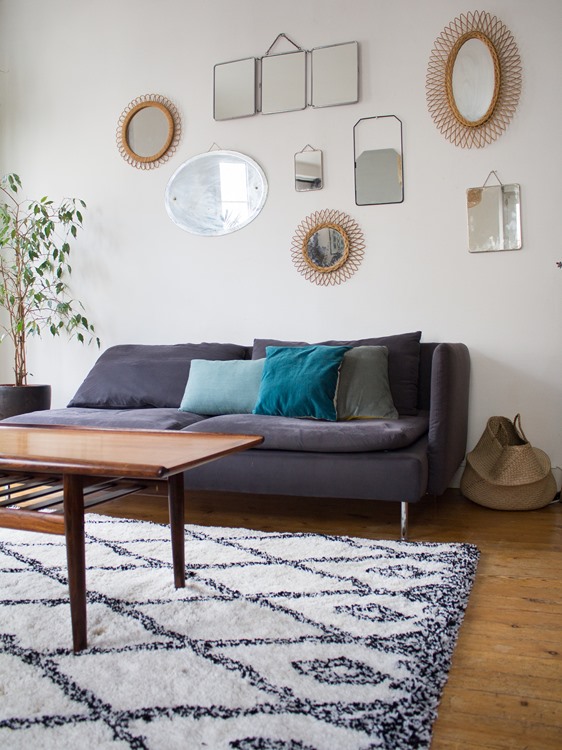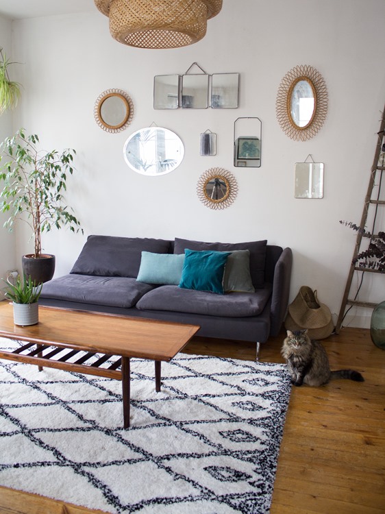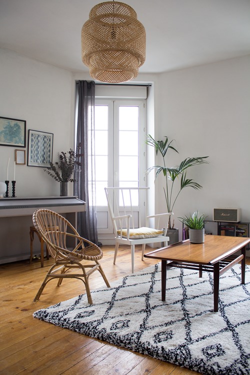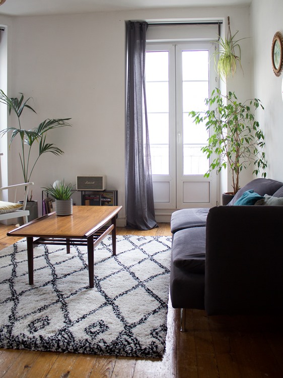 La semaine dernière, je vous emmenais dans ma chambre, aujourd’hui c’est du côté du séjour que je vous propose un petit tour des nouveautés. Et depuis la dernière visite, il y a eu pas mal de changement ! Côté salon d’abord, j’ai changé le tapis pour un nouveau, plus grand, plus épais, toujours dans cet esprit berbère que j’aime tant. Et puis surtout, j’ai enfin une table de salon digne de ce nom ! J’avais deux petites tables bricolées qui commençaient à être sérieusement fatiguées et que je voulais changer depuis longtemps : alors quand je suis tombée sur cette table basse de la célèbre designer danoise Grete Jalk, mon cœur à fait boum ! Editée par Møbelfabrik à la fin des années 50, elle est en palissandre de rio, et depuis que je l’ai remporté après des enchères endiablées, j’ai l’impression d’avoir un nouveau salon ! Le grand espace blanc sur le mur entre les deux fenêtres est en ce moment même en cours de changement, je vous montre ça bientôt :)
