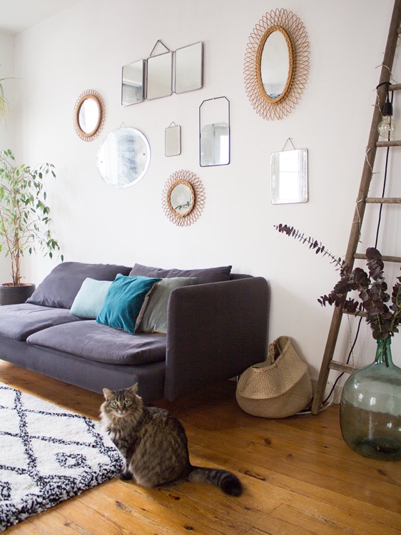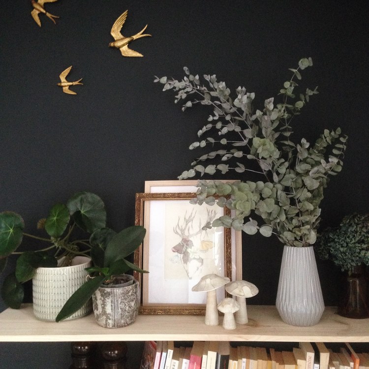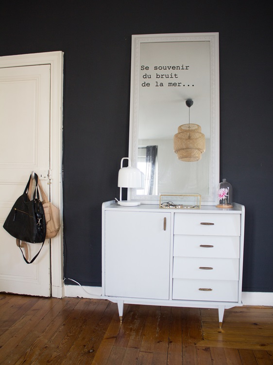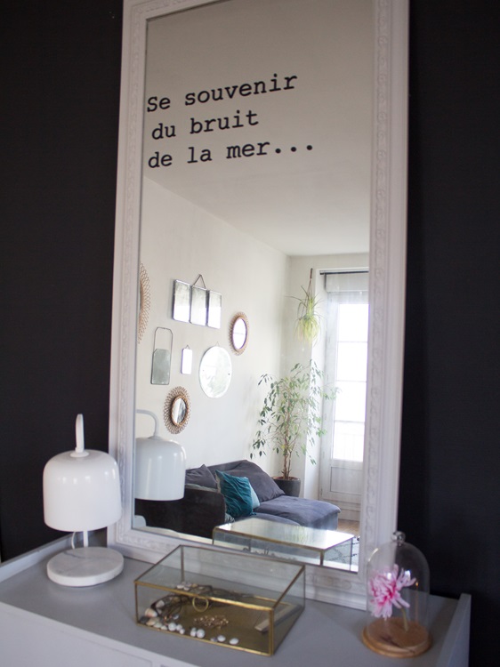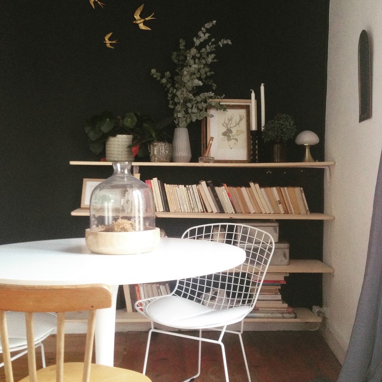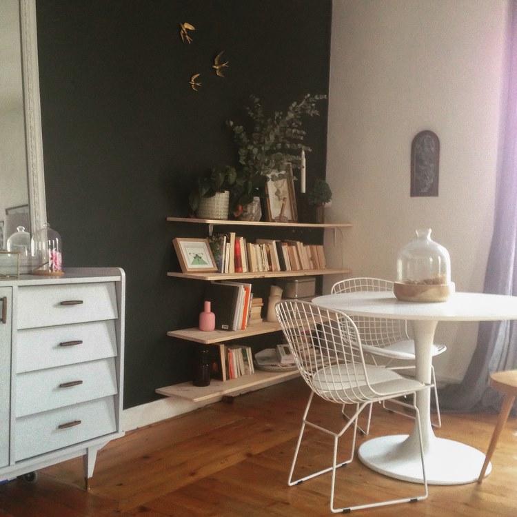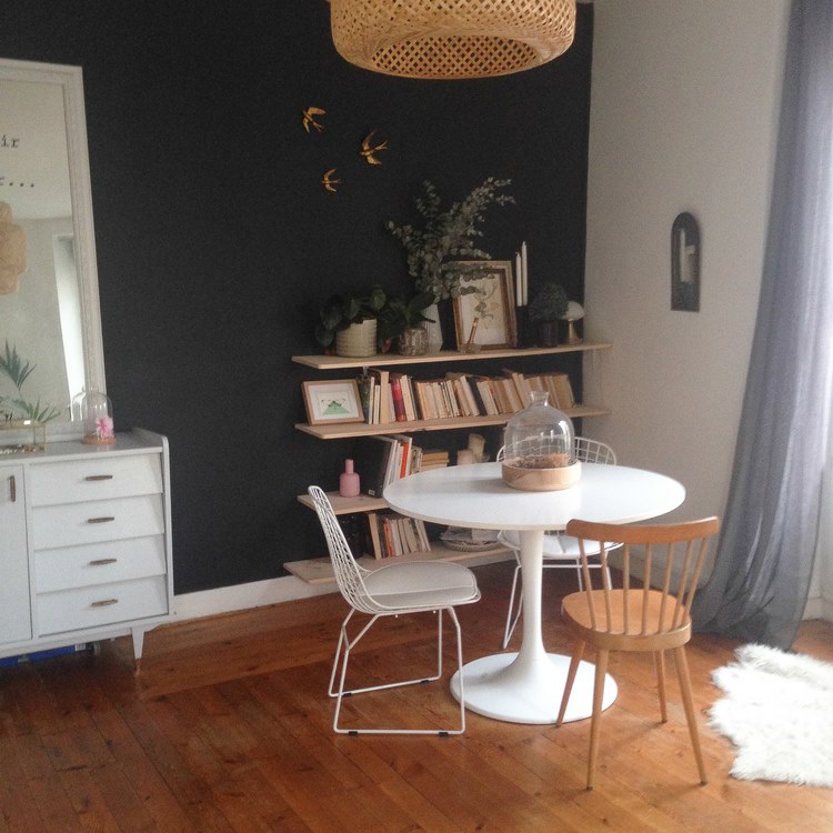 L’autre grosse nouveauté, c’est le mur du fond, que j’ai intégralement repeint en noir ! Cela m’a pris sur un coup de tête un après-midi, et j’avoue que si je me suis fait un peu peur sur le rendu quand j’ai attaqué, je ne regrette pas du tout le résultat ! Cela donne du caractère et de la profondeur à la pièce, et cela met tellement bien en valeurs les objets je trouve ! Bref, si jamais vous avez envie d’oser le noir, foncez ! J’ai aussi changé la table pour une table trouvée chez Ikea, qui a je trouve un air de la table tulip eero saarinen. Bon on est d’accord, un vague air seulement, mais pour dix fois moins cher, elle fait bien le job ! Pour ce mur noir, j’avais envie d’une bibliothèque aérienne et minimale, j’ai donc découpé et fixé des étagères en sapin : malheureusement, j’adorais le résultat mais depuis ces photos partagées sur instagram tout c’est écroulé (vieux murs et fixations murales ne font pas bon ménage !) ! Je vous montre quand même, en attendant de bricoler un autre meuble et de vous montrer tout cela plus en détails. L’indétrônable petit buffet vintage gris clair à retrouvé sa place, encore plus mis en valeur par le noir je trouve, avec le miroir ancien (retrouvez le DIY simplissime pour écrire ce qui vous plait sur un miroir ici )