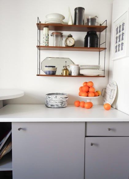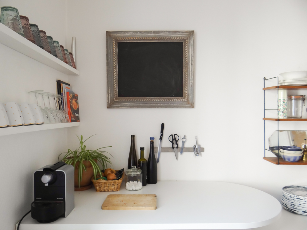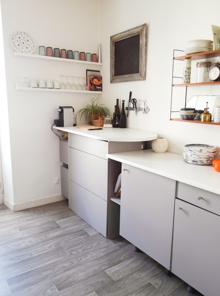 Lorsque je suis arrivée dans mon appartement il y a 2 ans, la cuisine méritait quelques aménagements. Le sol était très abimé (un vieux lino beige moucheté jaunit par le temps), un placard bringuebalant sous l’évier (il y avait même des poignées en… coquillage bleu !), une étagère menaçant de s’écrouler au dessus de la crédence, peinte en jaune et beige. Bref, il y avait du boulot ! Mais la pièce m’a tout de suite plu, avec sa grande porte fenêtre et son volume, elle avait beaucoup de potentiel. l’espace était assez vide : sur un côté, l’évier, et de quoi mettre le frigo, un lave linge et une gazinière. En face, il y avait dans un angle, un meuble bar soutenu par un pied en alu. J’ai d’abord été tenté de le démonter, afin de mettre une table et un joli buffet. Mais j’ai finalement opté des placards et un grand plan de travail, j’avais envie de rangements et de fonctionnalité !