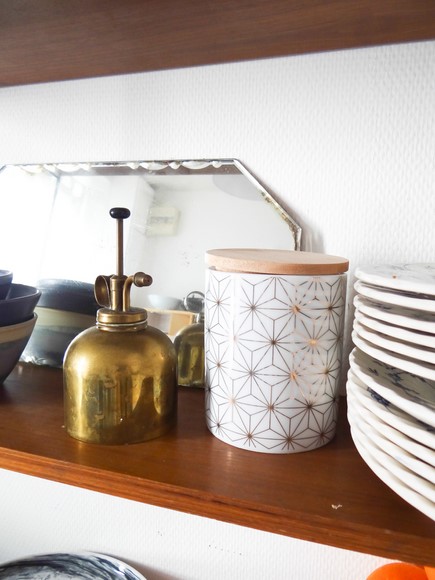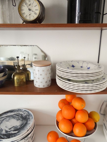 Merci beaucoup ! L’étagère est une étagère chinée, elle date des années 60 à peu près. Elle est fixée grâce à 2 vis dans le mur, qui tiennent l’étagère au niveau du haut des montant latéraux en métal (il y a une sorte de « boucle » pour passer les vis) :)