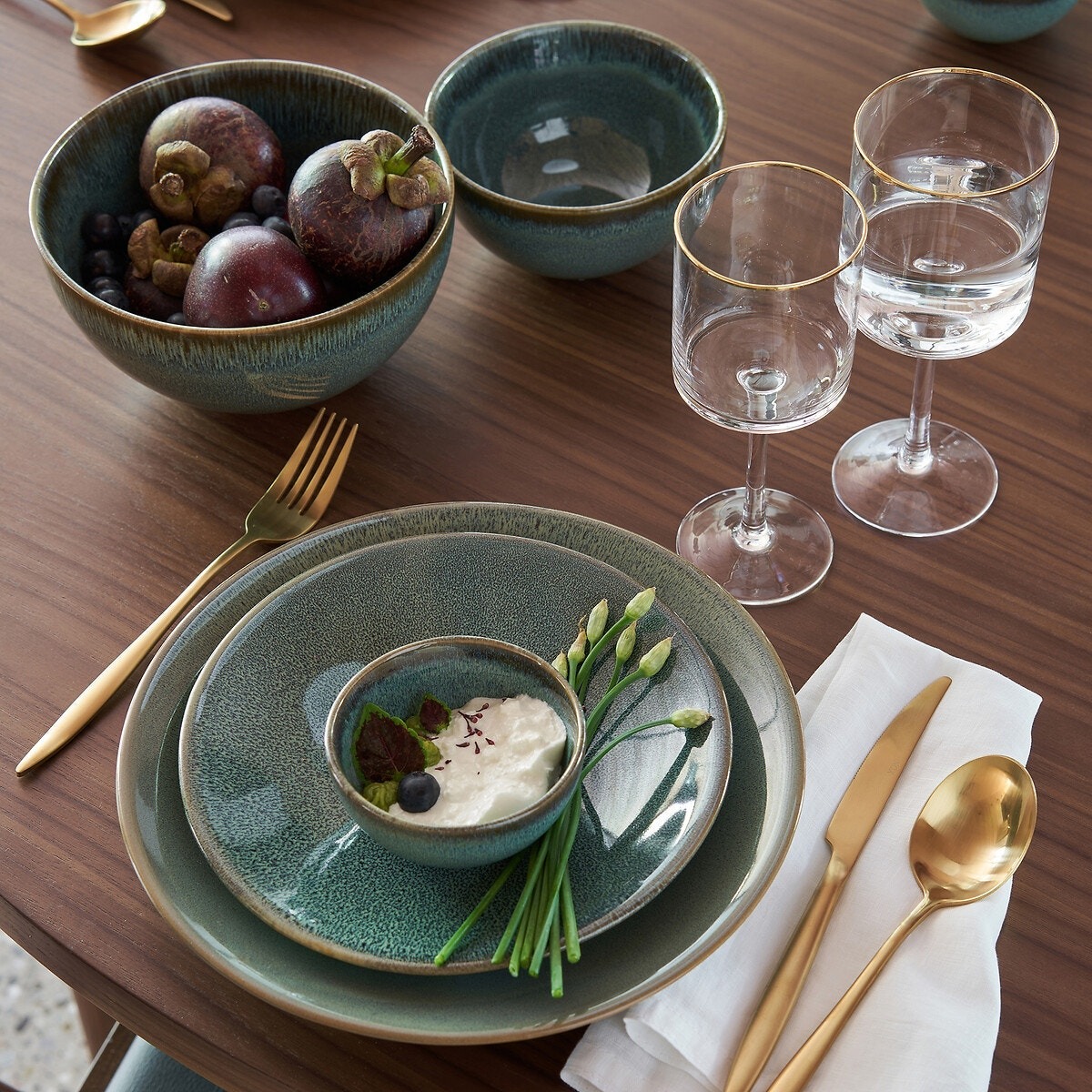 Ménagère 24 pièces dorée / Assiettes plates en grès, made in Portugal / Mugs