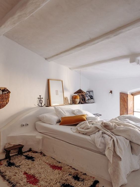 Une des caractéristiques des intérieurs méditerranéens rustiques, c’est incontestablement le mobilier maçonné. Si vous observez ce type d’intérieur, vous constaterez qu’il comporte très peu de « gros » meubles. Ceux-ci sont pour la plupart maçonnés. Une esthétique fonctionnelle mais qui prône également la simplicité, l’épure et une forme de pureté. Pour l’adopter, vous pouvez évidemment réaliser un dressing en béton cellulaire, mais également plus facilement un muret en placo ou même en mdf peint en blanc en guise de tête de lit.