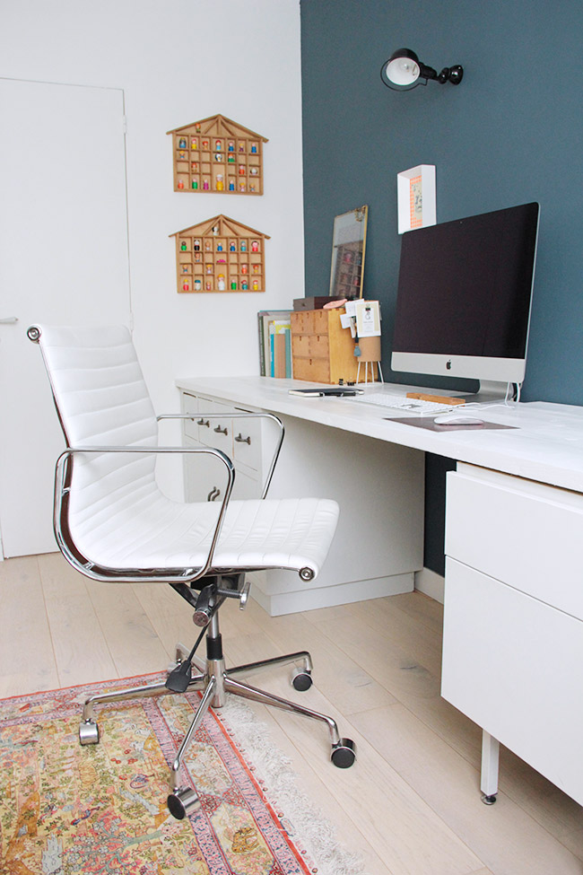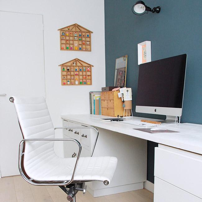 Et mon bureau car c’est important d’être bien dans la pièce où l’on peut passer plus de 8 heures d’affilées sans bouger ! Encore une fois, j’ai tout pensé pour optimiser au mieux l’espace et recycler du mobilier, pour en faire un coin cosy malgré tout. Et puis, c’est la seule pièce de la maison qui bénéficie d’une grande fenêtre avec vue sur le jardin. Elle est très lumineuse et les jours ensoleillés, c’est un vrai bonheur de travailler !