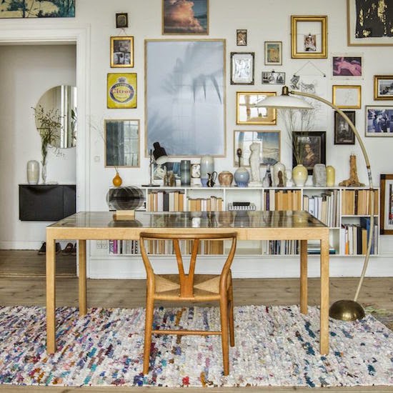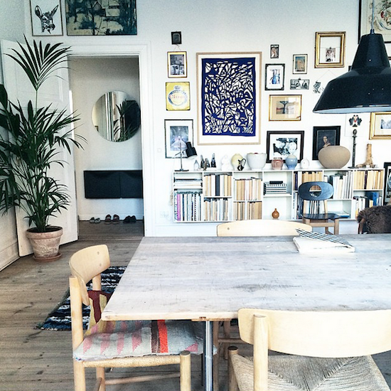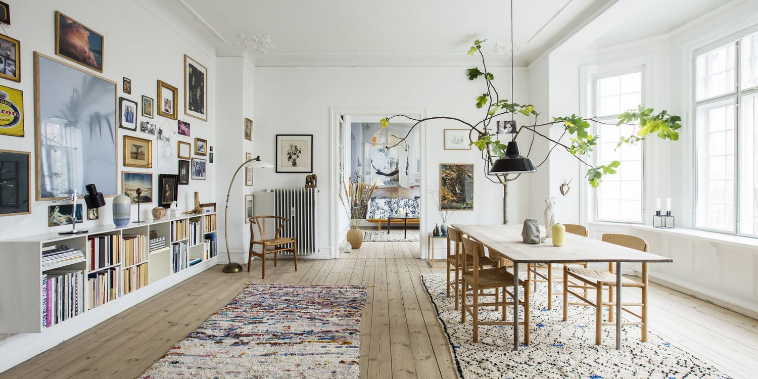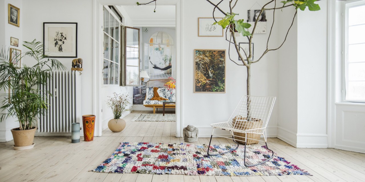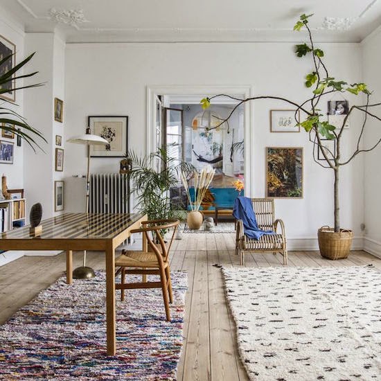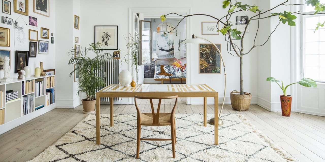 Another Ballroom est un projet qui met à l’honneur des meubles du 20e siècle, mais aussi le design et l’art contemporain, aux côtés de tapis marocains soigneusement choisis. Les produits et les pièces uniques sélectionnées sont présentés dans un showroom dédié, dans des boutiques aux abords de Copenhague ainsi que sur une boutique en ligne. Mais on peut aussi les retrouver dans la maison des créateurs, où ils sont somptueusement mis en scène. J’adore leur sélection dont les pièces en apparence hétéroclites se marient incroyablement bien : des œuvres et photographies d’art, du mobilier design, des céramiques et des textiles nobles, et puis ces magnifiques tapis Beni Ourain en laine naturelle, qui viennent apporter une touche bohème chic… tout est délicat et tellement raffiné ! Dans leur maison baignée de lumière, pour mettre en valeur ces éléments, c’est le blanc et le bois clair au sol qui a été choisi. Des plantes parsemées dans toutes les pièces viennent apporter cette touche de nature qui fait toute la différence !