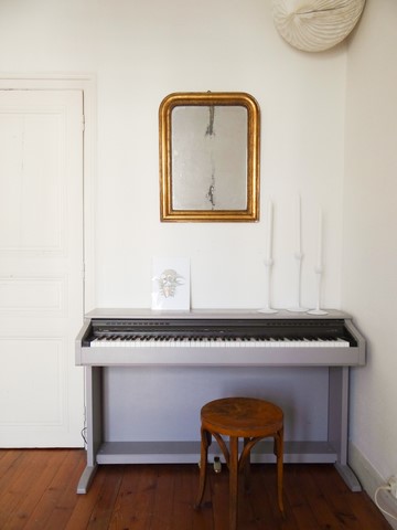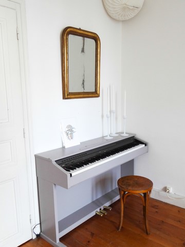 Merci Marie ! C’est un piano casio électronique tout simple, il était dans un plastique marron du type « faux bois » à l’origine, je l’ai repeint ;)