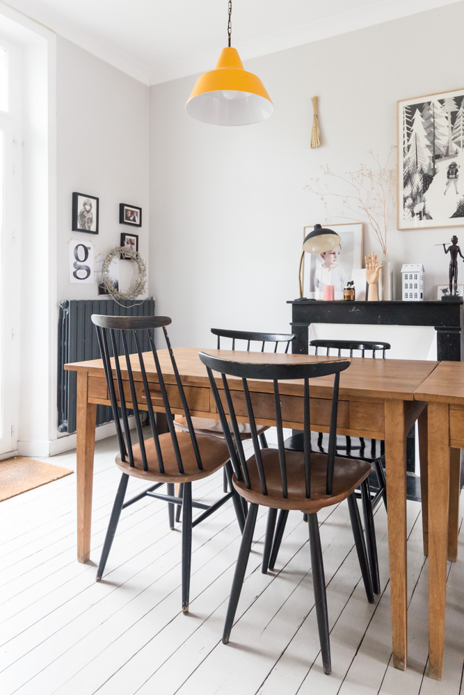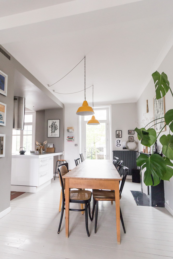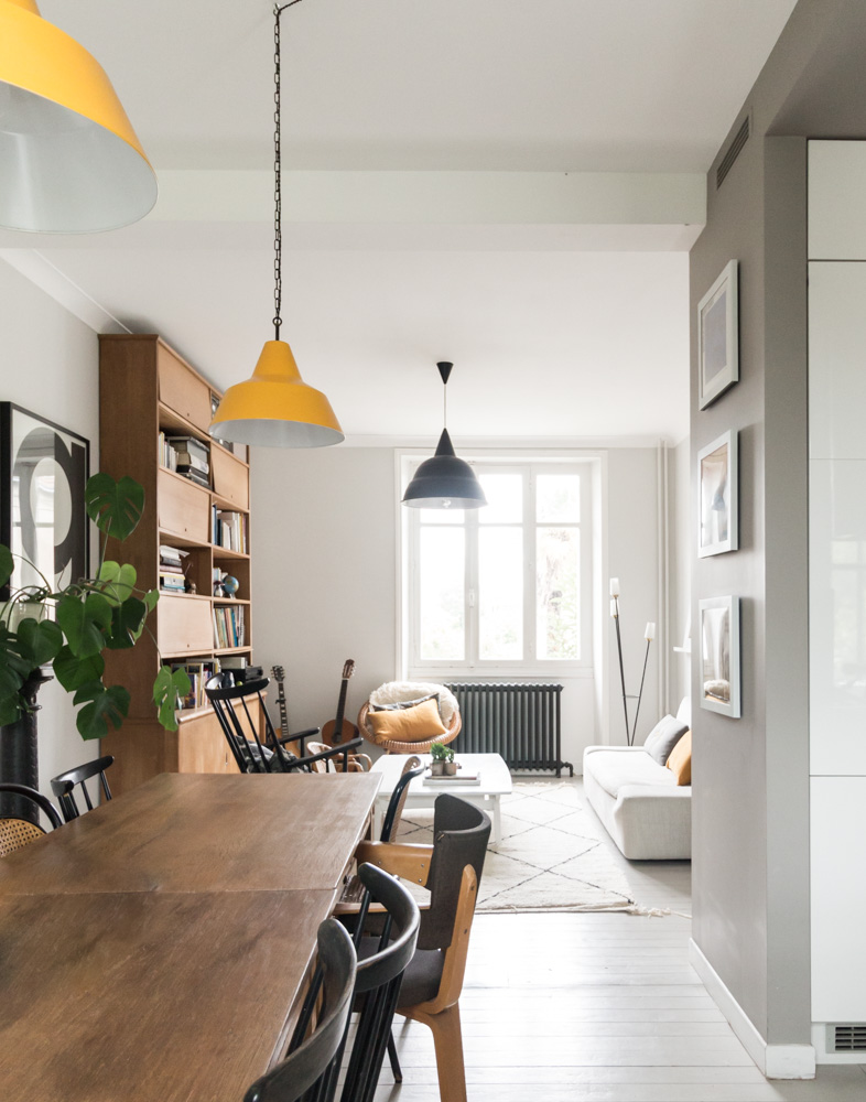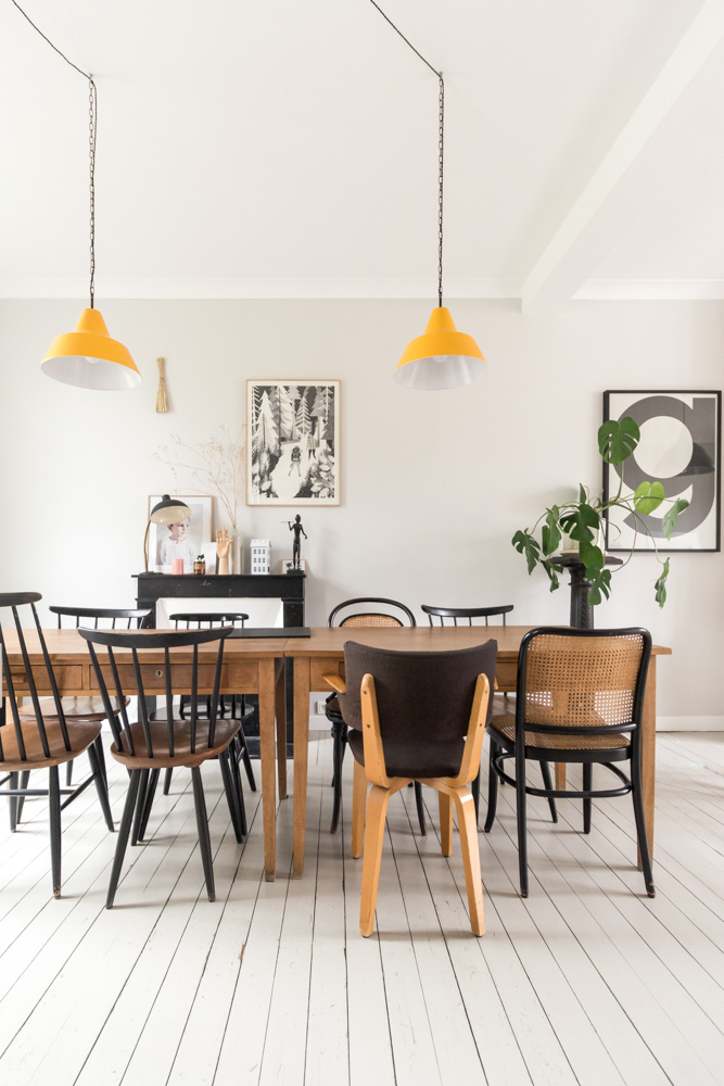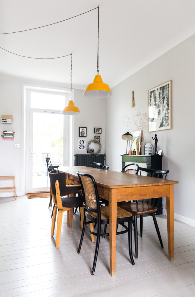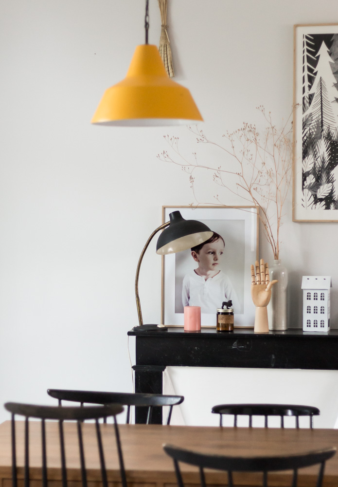 Dans le prolongement du salon principal, on trouve l’espace salle à manger, qui est également ouvert sur la cuisine. Avec sa porte donnant sur le jardin, sa cheminée ancienne, sa grande table entourée d’une collection de chaises scandinaves et ses 2 suspensions industrielles jaunes qui viennent répondre aux coussins du salon, elle est le théâtre idéal pour des dîners conviviaux !