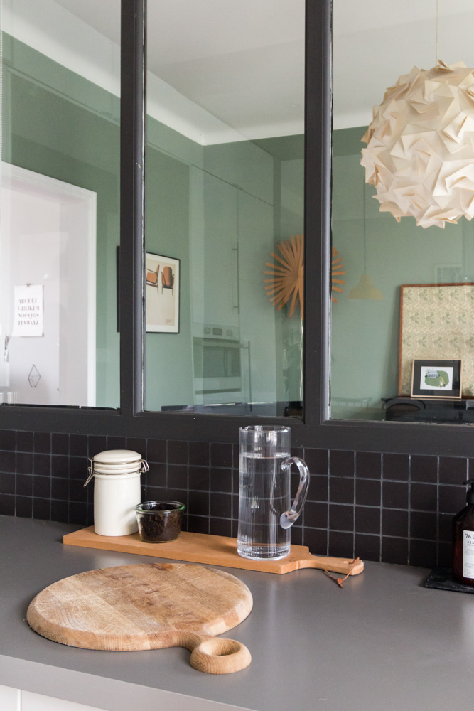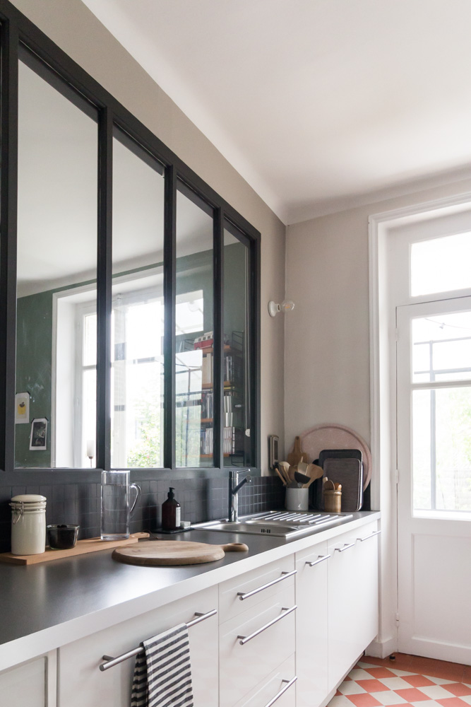 Dans la cuisine au sol d’époque, Muriel a joué la carte de la sobriété pour le mobilier en misant sur des blancs et gris. Une verrière offre également une jolie perspective sur le salon privé et rend cette pièce extrêmement lumineuse. Sa grande porte fenêtre s’ouvre sur un petit jardin d’hiver avec une verrière d’époque.