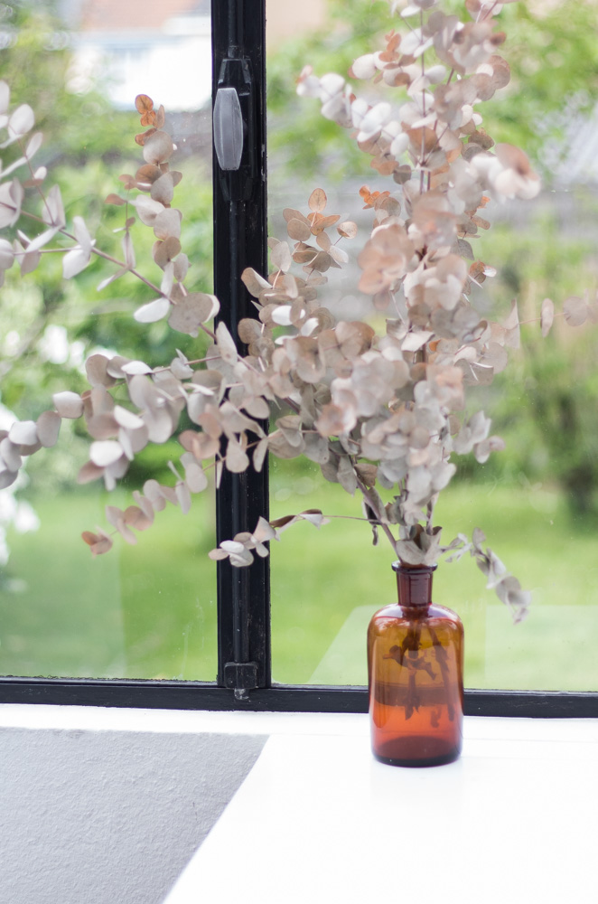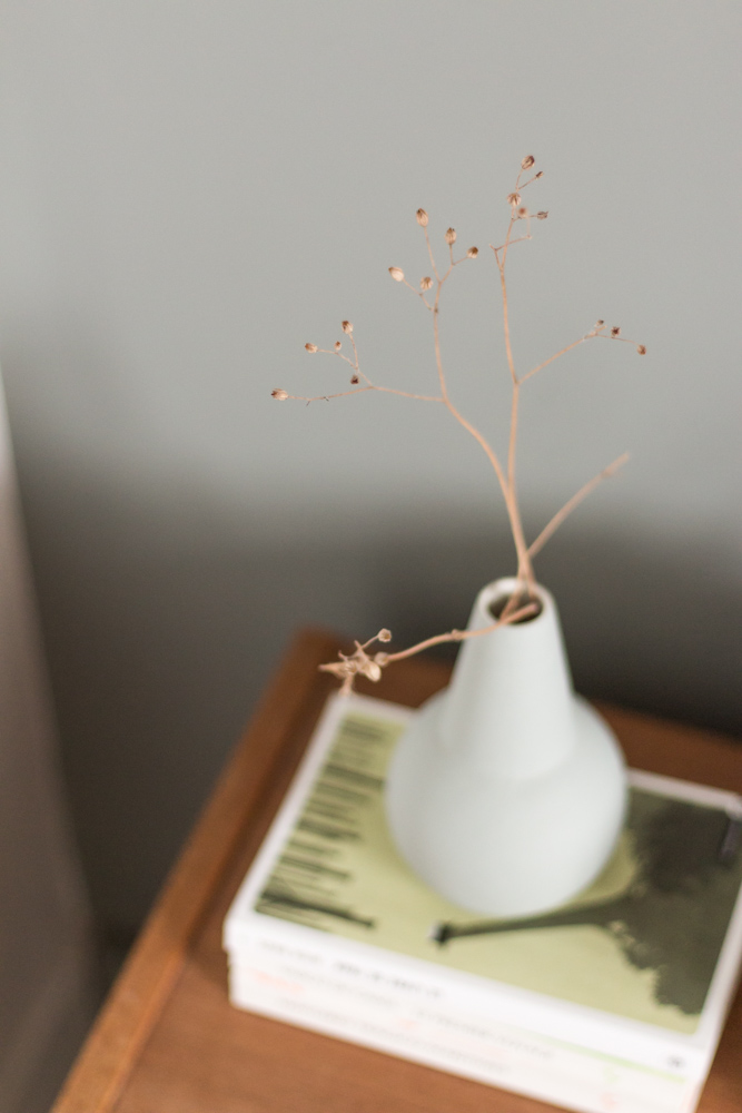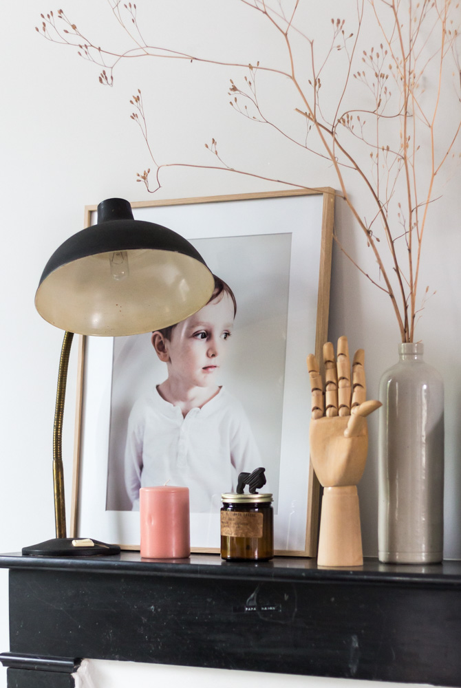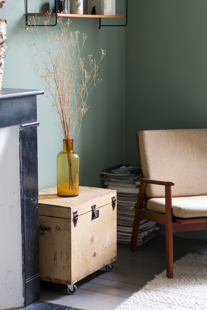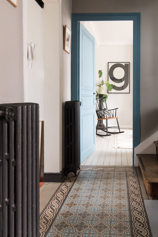 La maison de Muriel est une belle Nantaise 1900 comme je les aime : des carreaux de ciment, du parquet, des portes anciennes, cheminées d’époque, des fenêtres hautes et des radiateurs en fonte, ici tous les éléments d’époque ont été préservés et mis en valeur. Le mobilier, pour l’essentiel chiné, est une véritable collection de trésors scandinaves et industriels ! En plus de ses talents de chineuse, Muriel possède un véritable sens de la mise en scène et des couleurs. En témoigne ses mariages parfaitement maîtrisés de beiges et de gris, qui apportent aux espaces de la profondeur et du chic tout en sobriété. Les bleus et les verts habillent également certains murs et portes, eux aussi minutieusement choisis pour réveiller en douceur l’ambiance feutrée de la maison. Pour amener des notes contemporaines à cet univers vintage, la maison est parsemée d’œuvres et objets de créateurs talentueux qu’elle aime dénicher pour sa boutique.