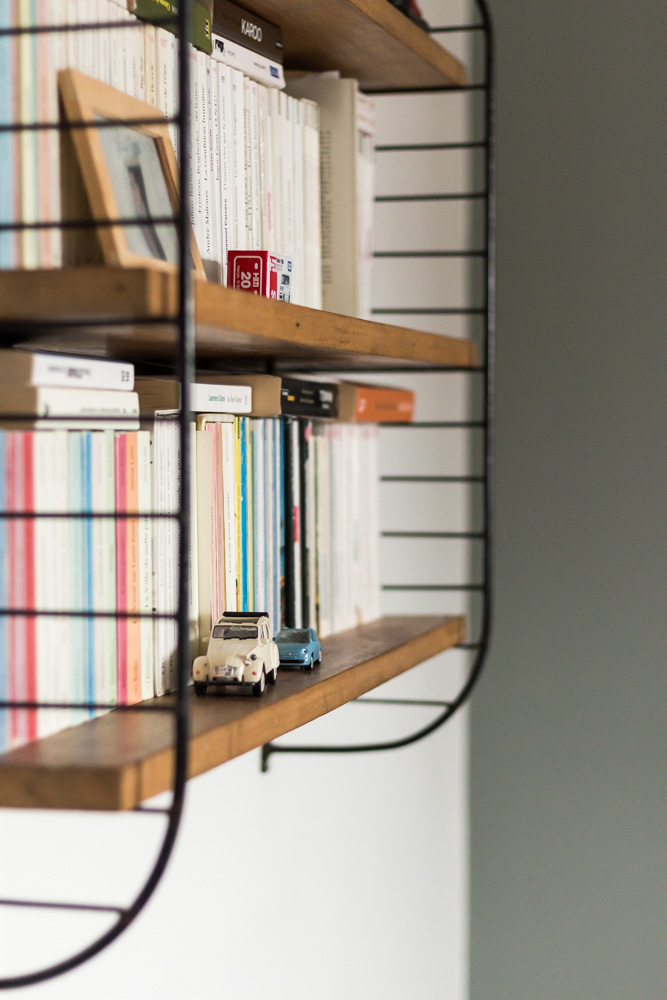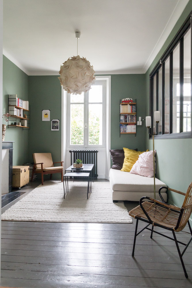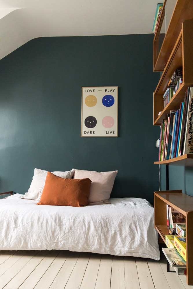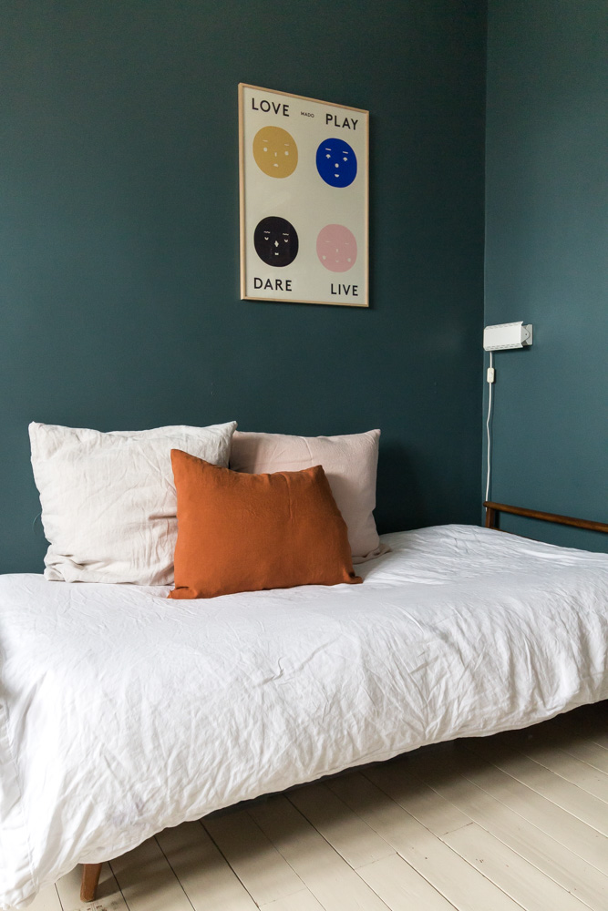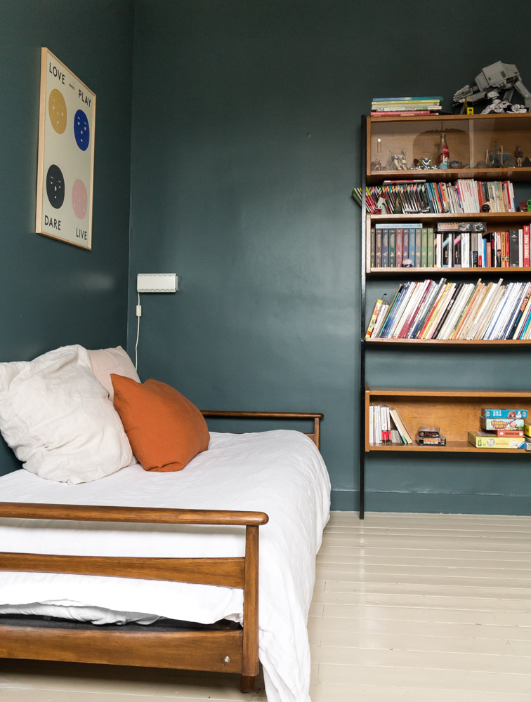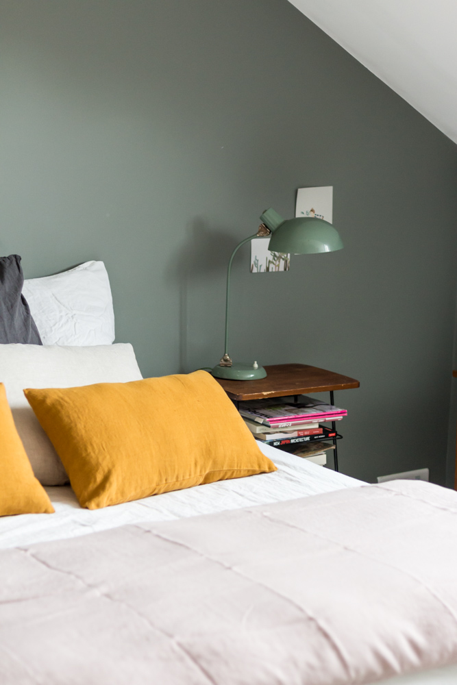 Pour terminer cette visite, je vous emmène dans la chambre de son fils. Le point fort de cette pièce, c’est incontestablement ces murs vert sombre, presque gris, réveillés de touches de couleurs vives. Un univers plus masculin mais dans lequel on retrouve néanmoins toujours la patte de la maîtresse des lieux !