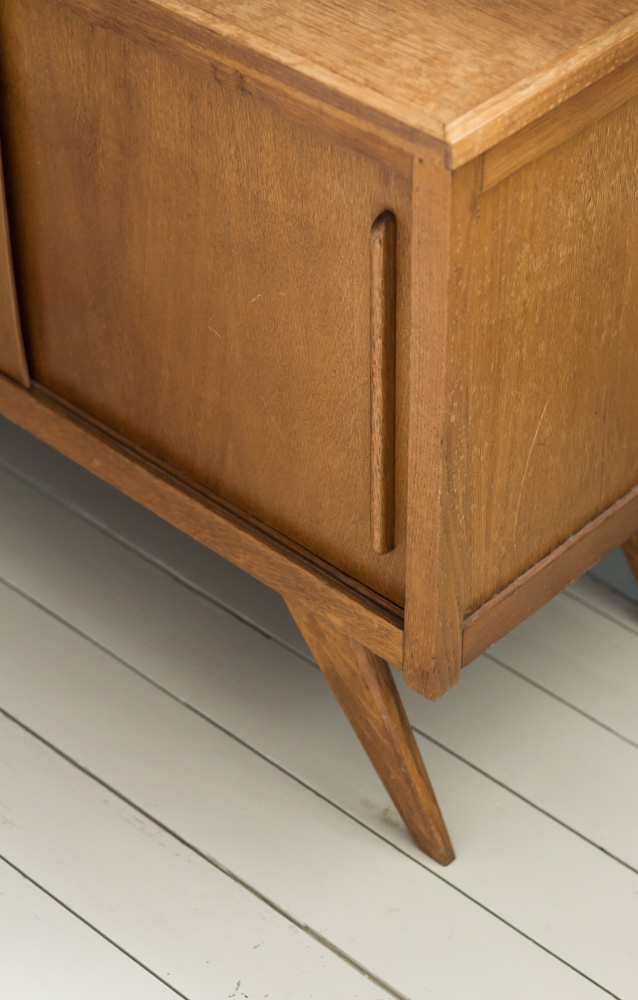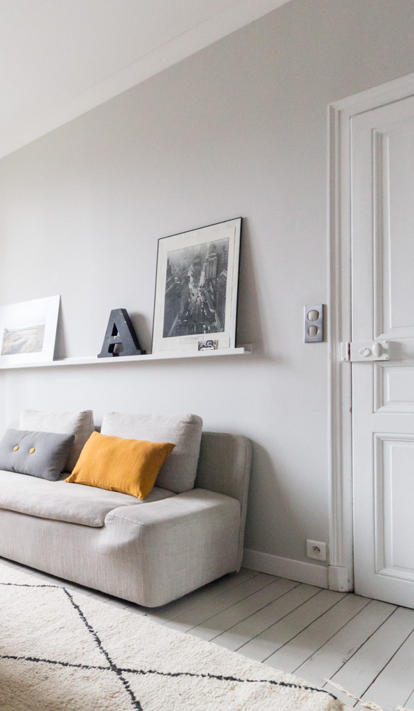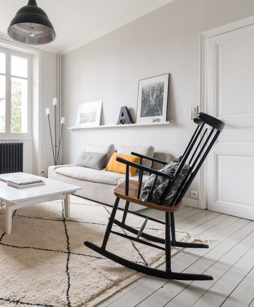 A droite de l’entrée et de son joli sol d’origine en carreaux de ciment, se trouve le salon principal. C’est ici que Muriel et son mari aiment recevoir leurs proches. Des camaïeux de blancs et gris ont été travaillés sur les murs et sols comme dans les éléments de décorations, et relevés de quelques touches de noir et moutarde. Cet écrin monochrome met parfaitement en valeur le grand bahut bibliothèque chiné en teck.
