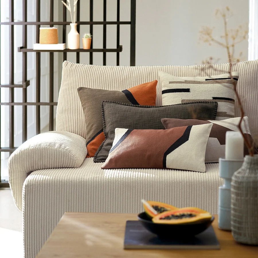 Taies d’oreiller rayures géométriques / Coussin kaki / coussin black and white / Tapis ovale relief / Coussin motifs tuffés / Coussin blanc bandes entrelacées / Coussin motif végétal / plaid gaze de coton lavé /housse de coussin 3 bandes noires / Tapis courbes colorées