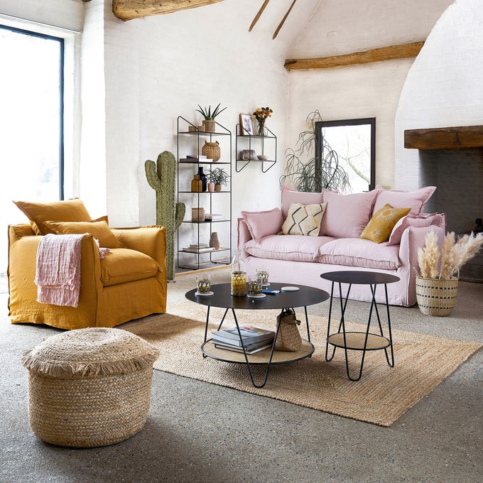 Sources : Vaisselier / La redoute (Canapé en lin, Tapis jute)