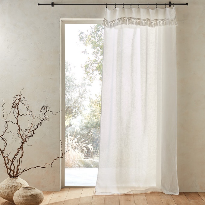 Dans les matières d’abord, avec le lin, ou encore le gaze de coton et leur style décontracté. Du côté des motifs, là encore les rayures sont un sans faute, mais les motifs floraux fonctionnent aussi très bien. L’uni n’est bien-sûr pas en reste, mais pour lui apporter une touche bohème, misez sur des détails qui changent tout : Voilage à nouettes ou à franges, ou encore liseré brodé et pompons.