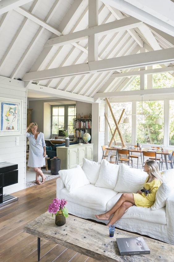 Dans le séjour, un canapé cosy et moelleux aux lignes sobres et des meubles en bois au look intemporel sont une base parfaite.