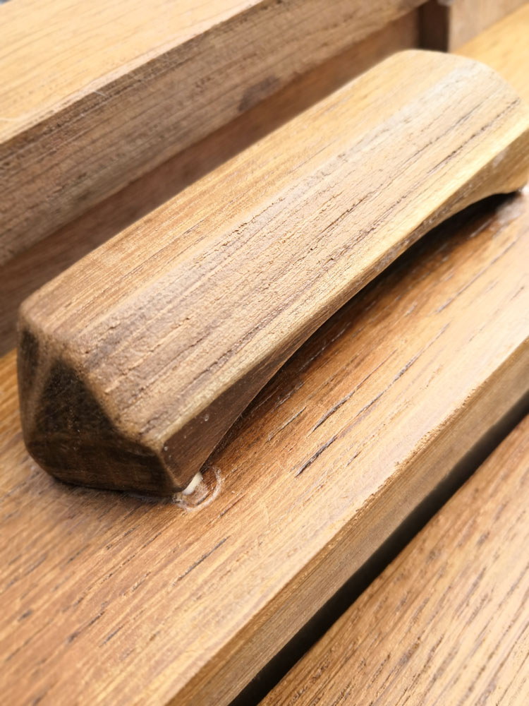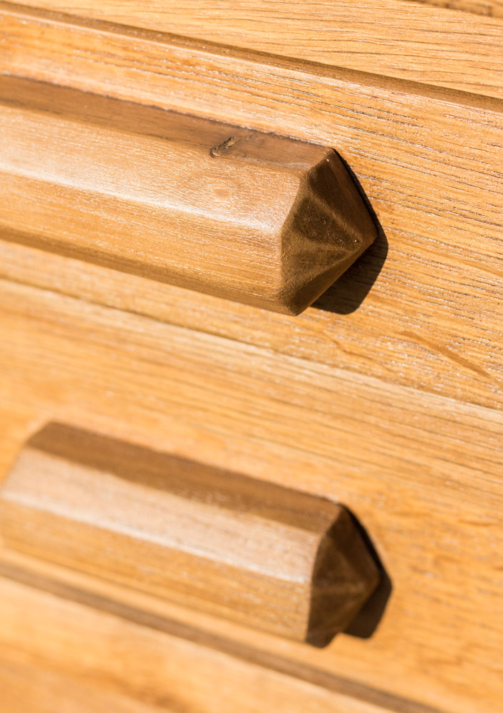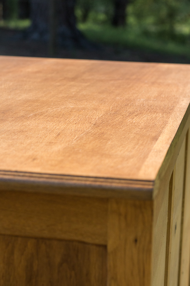 Surélevez votre meuble du sol afin de pouvoir travailler sur les parties basses y compris. Si le meuble est imposant et lourd, comme ici ce meuble de métier, disposez-le simplement sur des tasseaux. Pour les besoins des photos, le shooting a été réalisé au soleil : je vous recommande toutefois de vous mettre à l’ombre si vous travaillez dehors pour appliquer une huile de finition sur un meuble en bois.