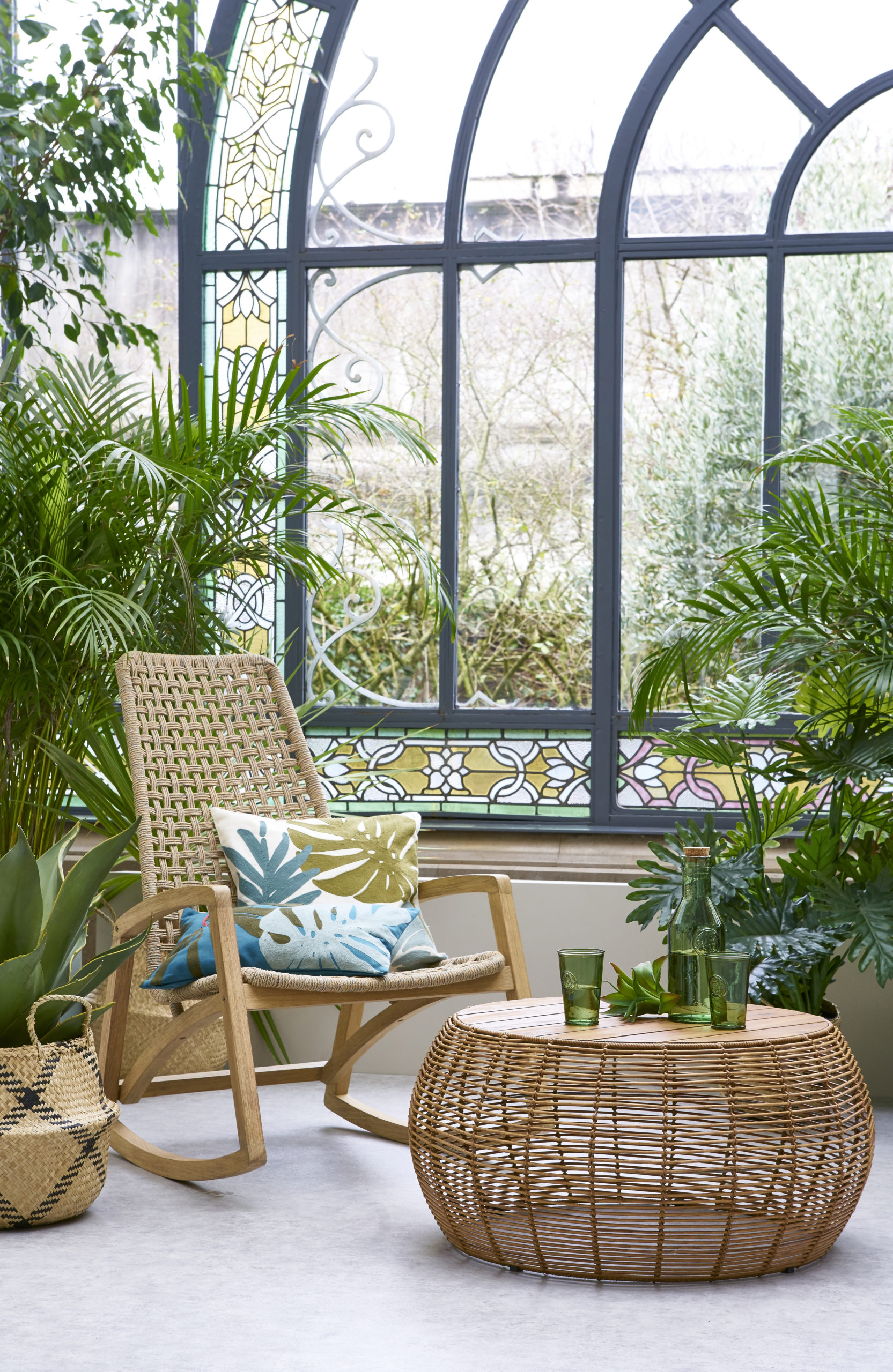1. Rocking chair cordes et eucalyptus , FSC / 2. Table basse en canne de rotin