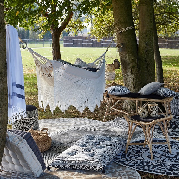 Le hamac ou le fauteuil suspendu, c’est un peu le symbole par excellence de l’esprit bohème. Qu’ils soient suspendus à une pergola, une poutre, ou tout simplement accrochés entre 2 arbres, ils nous invitent à nous laisser bercer par le temps qui passe. Le seul risque : ne plus réussir à le quitter ;) Privilégiez des matières en tissu, et tressées ou brodées pour un effet total look.