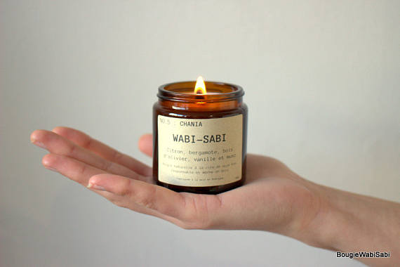 6/ Bougie à la cire de soja wabi sabi : bougies fabriquées à la main par un artisan en Bretagne, cire éco-responsable, pot en verre made in France, liquette en kraft recyclé.
