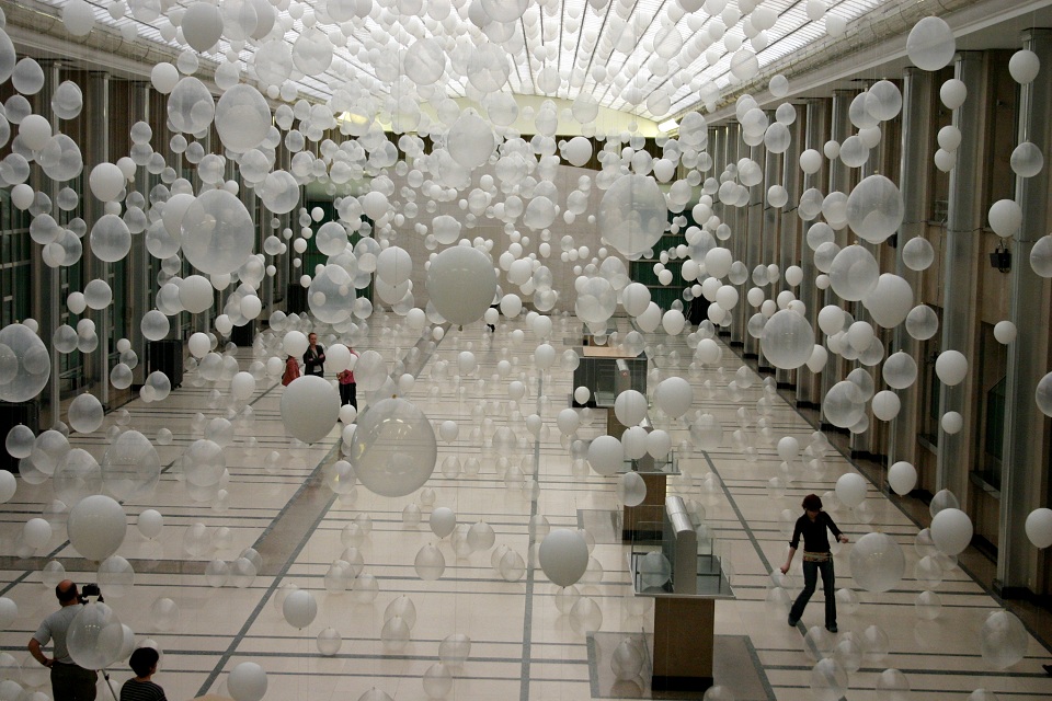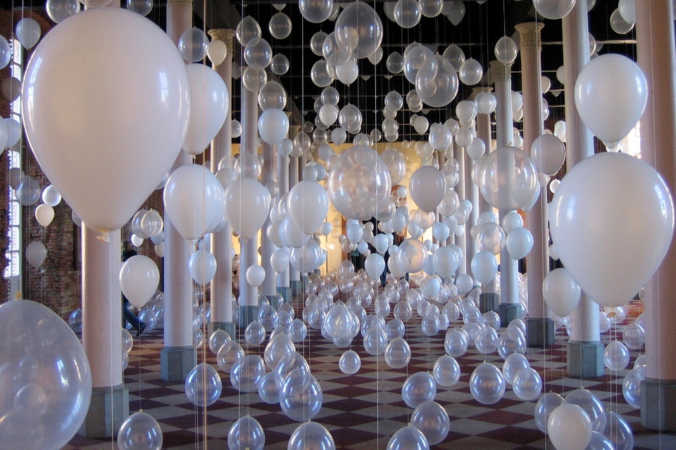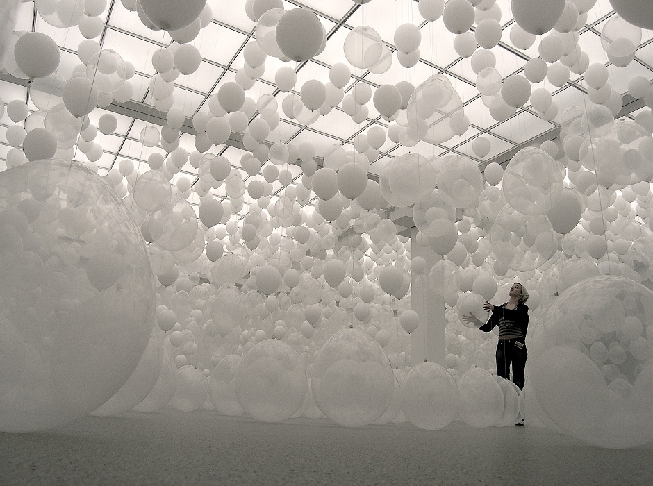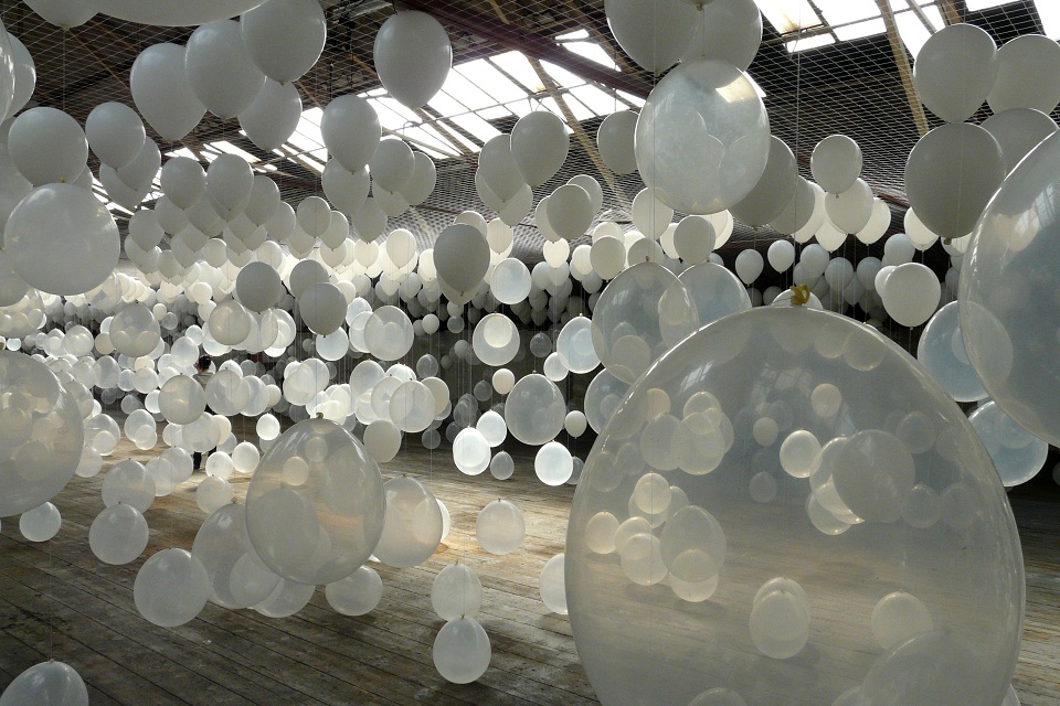 William Forsythe, danseur et chorégraphe américain, a réalisé une installation faite de milliers de ballons blancs translucides en suspension. « La foule dispersée » est une œuvre en mouvement, où le spectateur est libre de déplacer les ballons à sa guise. Si la magie de l’espace créé transparait dans ces photos, elle prend pleinement son sens lorsque l’on s’y trouve immergé, puisque viennent s’y ajouter la bande sonore faisant partie de l’expérience et le délicat mouvement des ballons tout autour de soi. Une installation comme je les aime, pleine de poésie et de fragilité !