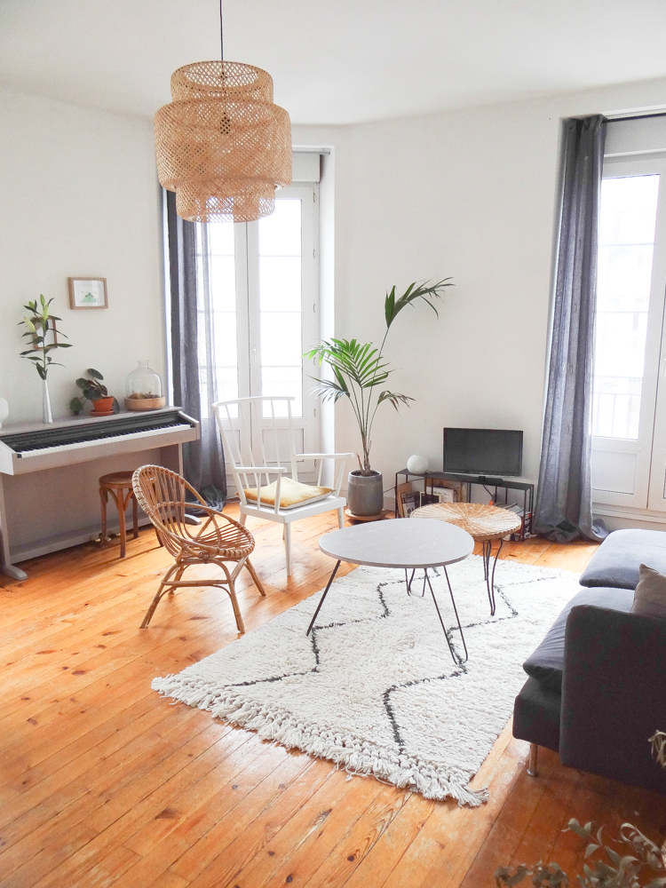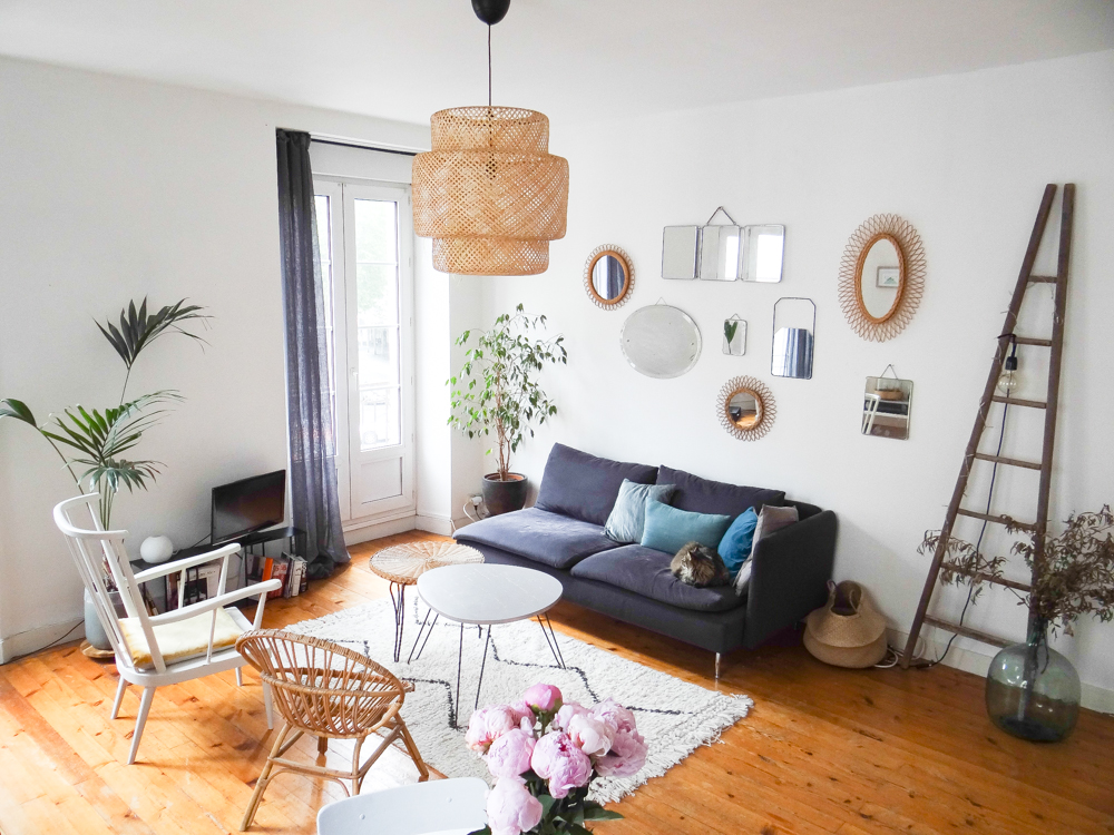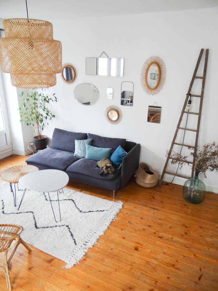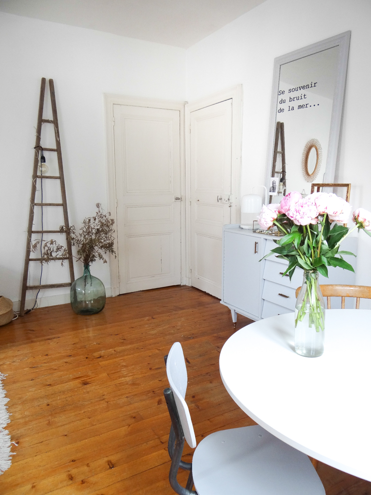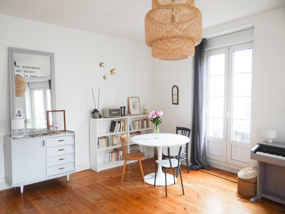 Le canapé vient du suédois, comme la table et la suspension (je ne me lasse pas des suspensions tressées, et allumé c’est tellement poétique !). Côté salon, les coussins et le tapis ont été achetés chez AM.PM, comme la lampe blanche et marbre sur le buffet gris. La table basse tripode est une fabrication maison, à côté d’une table en rotin chinée. Les deux fauteuils ont été chinés également, tout comme les miroirs, l’échelle, la dame jeanne, mais aussi le buffet gris et les chaises de la salle à manger, ou encore le lustre à pampille dans le couloir, trouvé sur ebay.