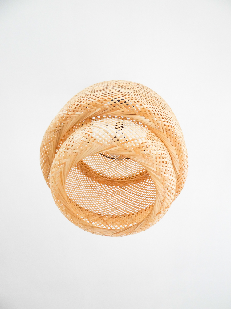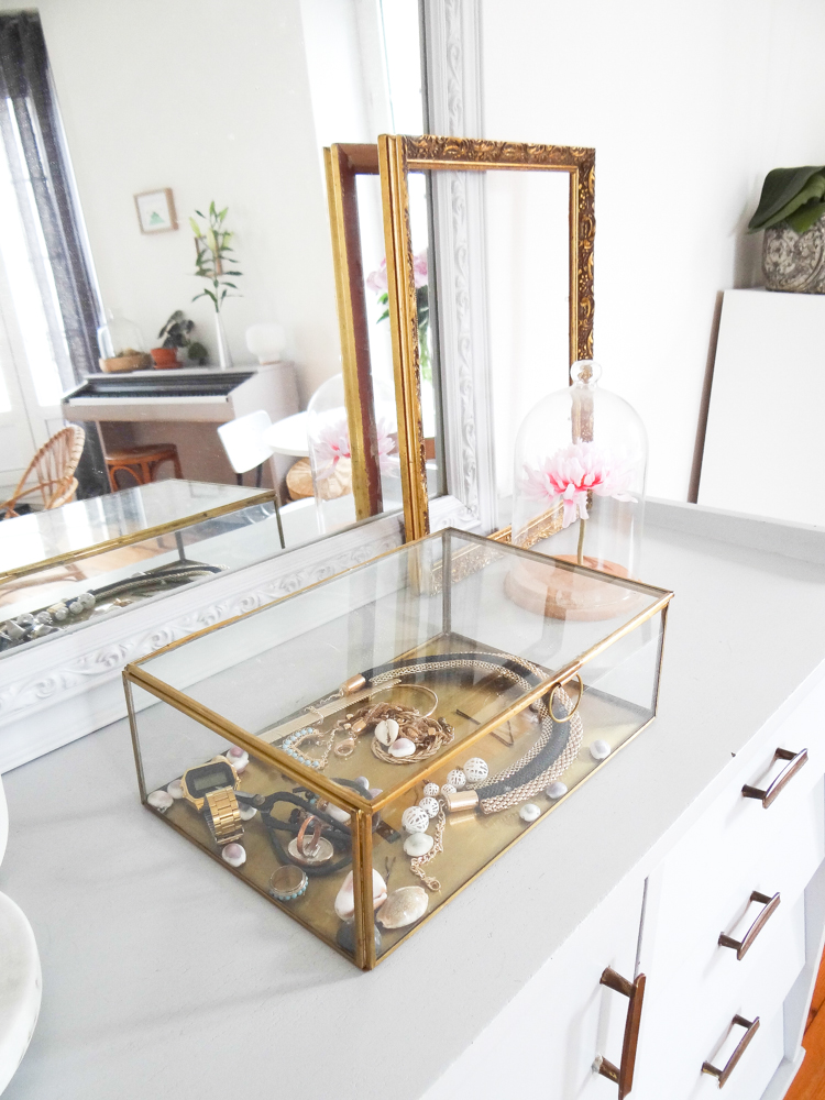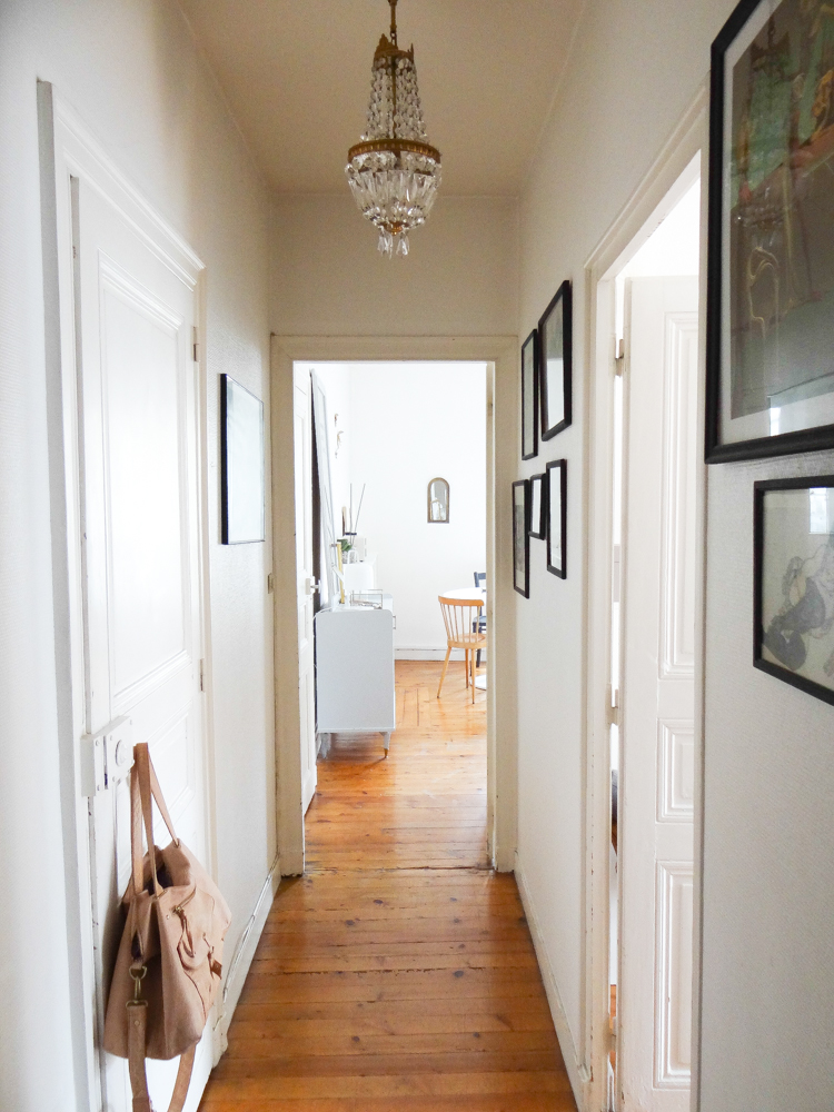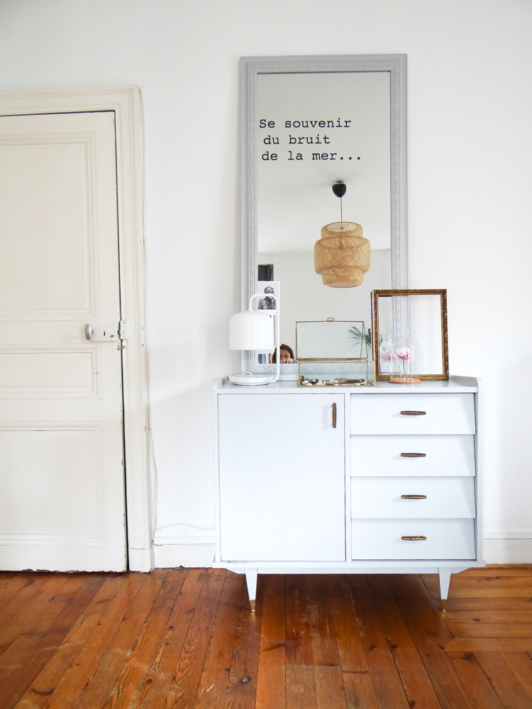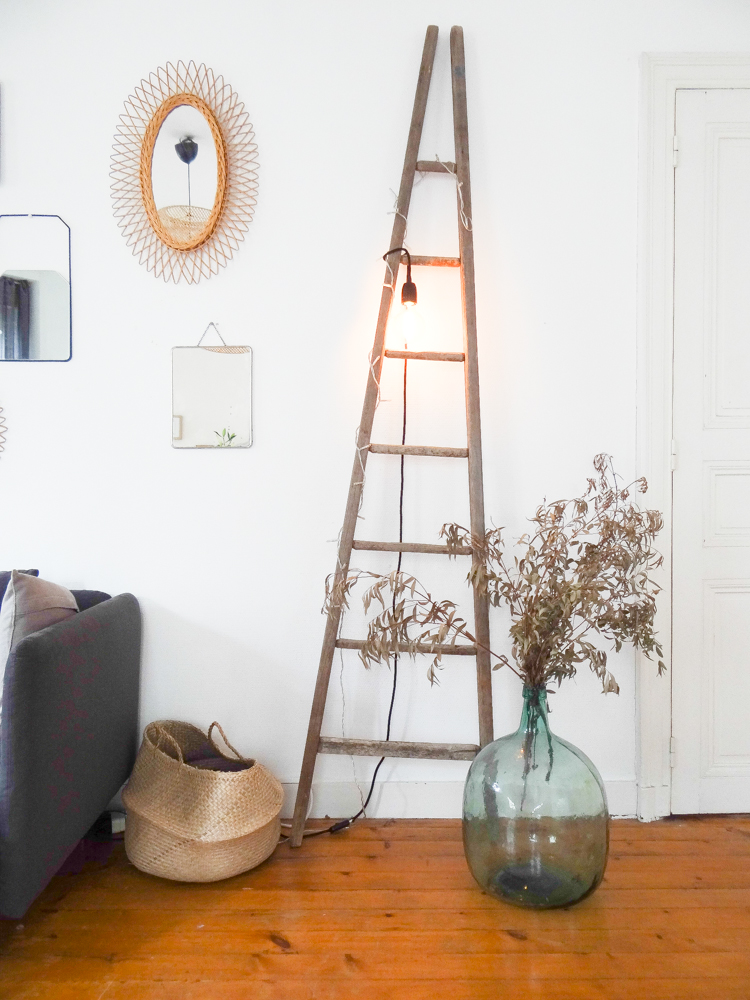 Le canapé vient du suédois, comme la table et la suspension (je ne me lasse pas des suspensions tressées, et allumé c’est tellement poétique !). Côté salon, les coussins et le tapis ont été achetés chez AM.PM, comme la lampe blanche et marbre sur le buffet gris. La table basse tripode est une fabrication maison, à côté d’une table en rotin chinée. Les deux fauteuils ont été chinés également, tout comme les miroirs, l’échelle, la dame jeanne, mais aussi le buffet gris et les chaises de la salle à manger, ou encore le lustre à pampille dans le couloir, trouvé sur ebay.