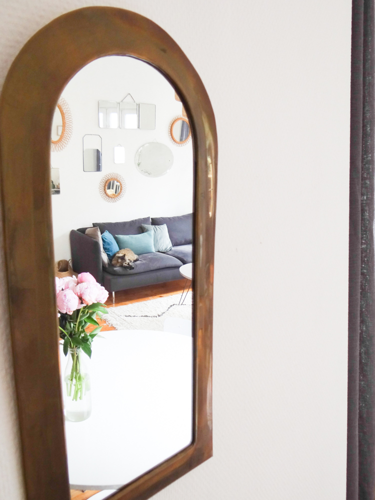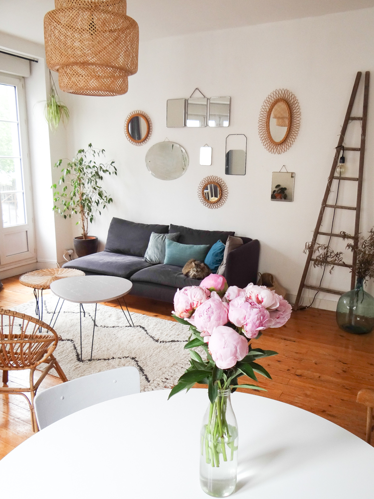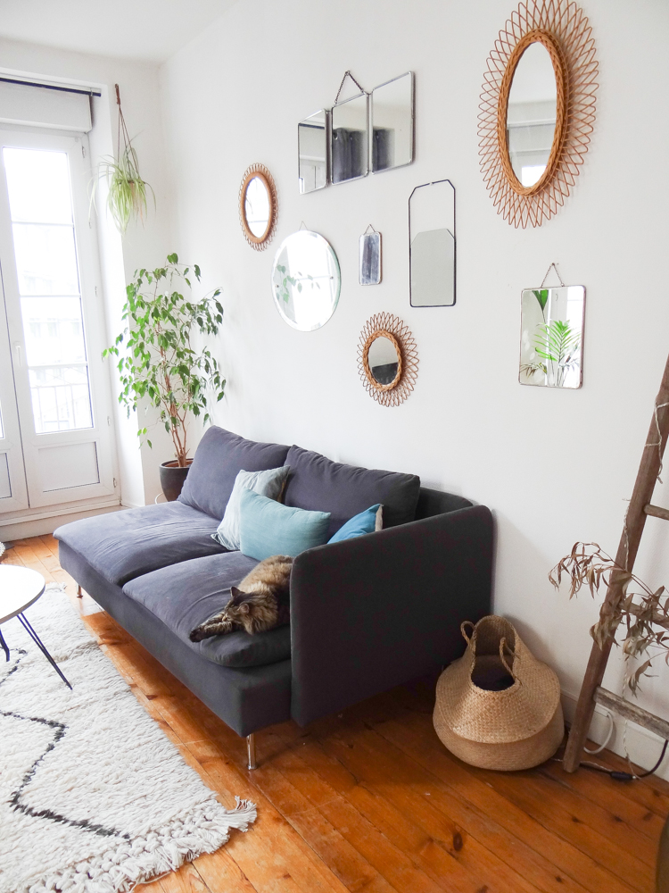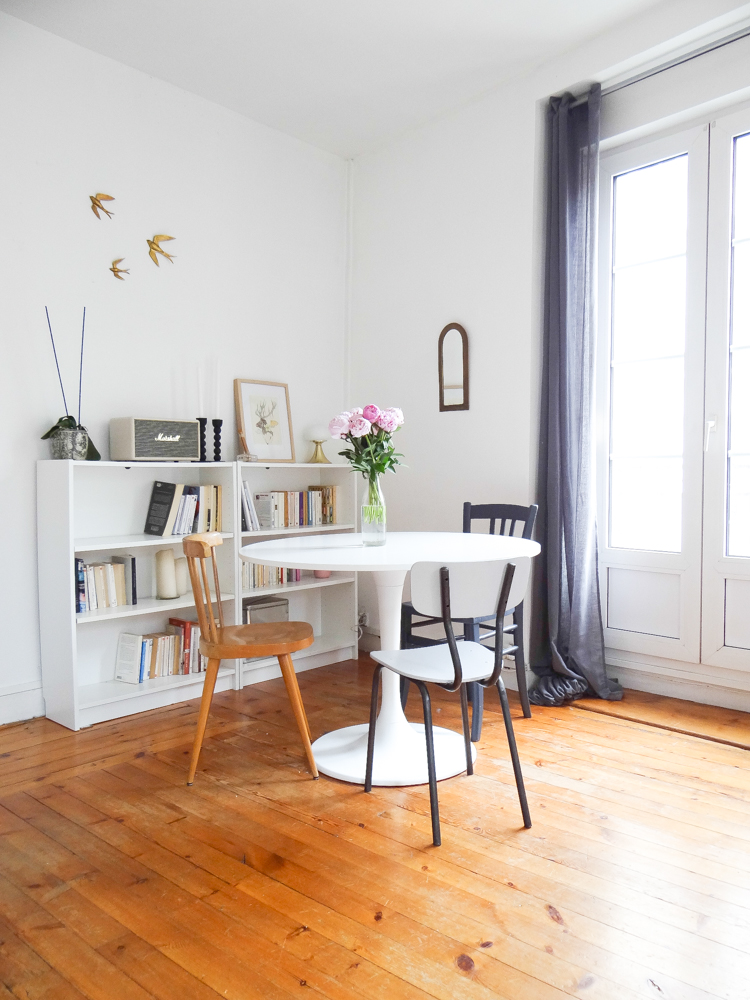 Je vous avais déjà emmené dans le salon il y a quelques temps, il y a eu quelques changements depuis. Le mur de miroirs s’est étoffé, j’ai fabriqué une baladeuse pour l’échelle, j’ai ajouté quelques plantes et objets, changé les coussins, et twisté ma table de salle à manger au style campagne chic pour quelque chose de plus pop (la table Eero Saarinen de mes rêves n’étant pas pour demain, j’ai trouvé celle-ci qui en a un petit air). J’ai ajouté une bibliothèque sur le mur derrière, qui préfigure un meuble sur mesure que j’aimerais construire. En attendant, les Billy font le job à moindre coût. La déco de la pièce à vivre reste un mélange de meubles et objets achetés mais surtout chinés, mais j’avoue que j’apprécie de plus en plus les touches plus modernes dans les déco chinées, les uns mettant en avant les autres. En termes de couleurs, j’aime bien découvrir des intérieurs immaculés d’où rien ne dépasse, mais ce n’est pas pour moi au quotidien et j’ai aussi besoin d’un peu de vie dans ma maison. J’ai donc opté pour un compromis qui me ressemble, quelque chose de plus vivant, mais qui reste doux et dans des couleurs neutres. Et puis j’avais envie de mettre en valeur le volume de la pièce, avec ses murs blancs, son plafond haut, et ses trois grandes fenêtres, pour lesquels j’avais eu un coup de cœur lors de ma première visite. Le gros chat est inclus dans le package :). Le trio d’hirondelles au mur date des années 60/70 et vient des usa, je les ai longtemps cherché et je les adore, je crois que c’est l’objet qui me ressemble le plus !