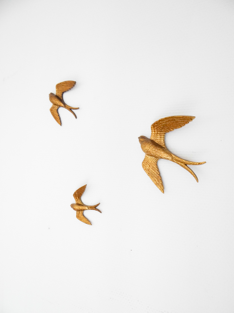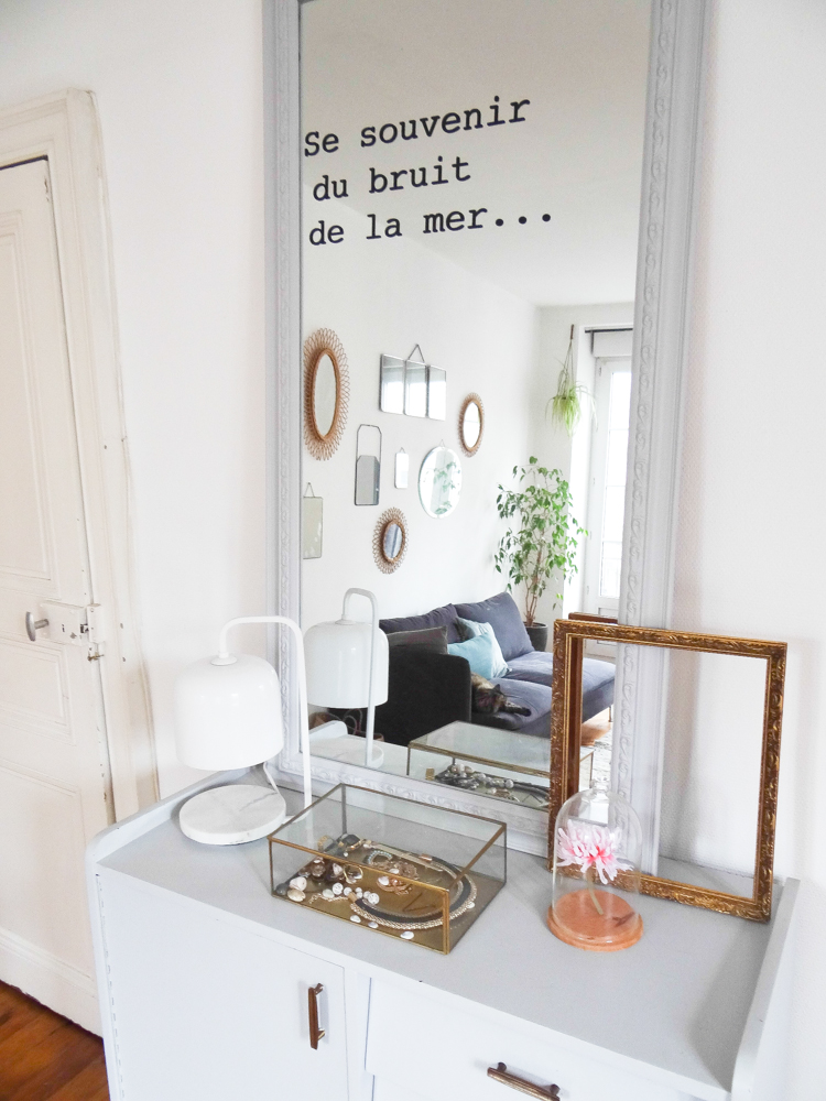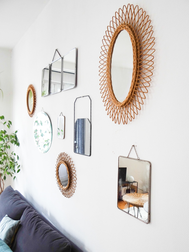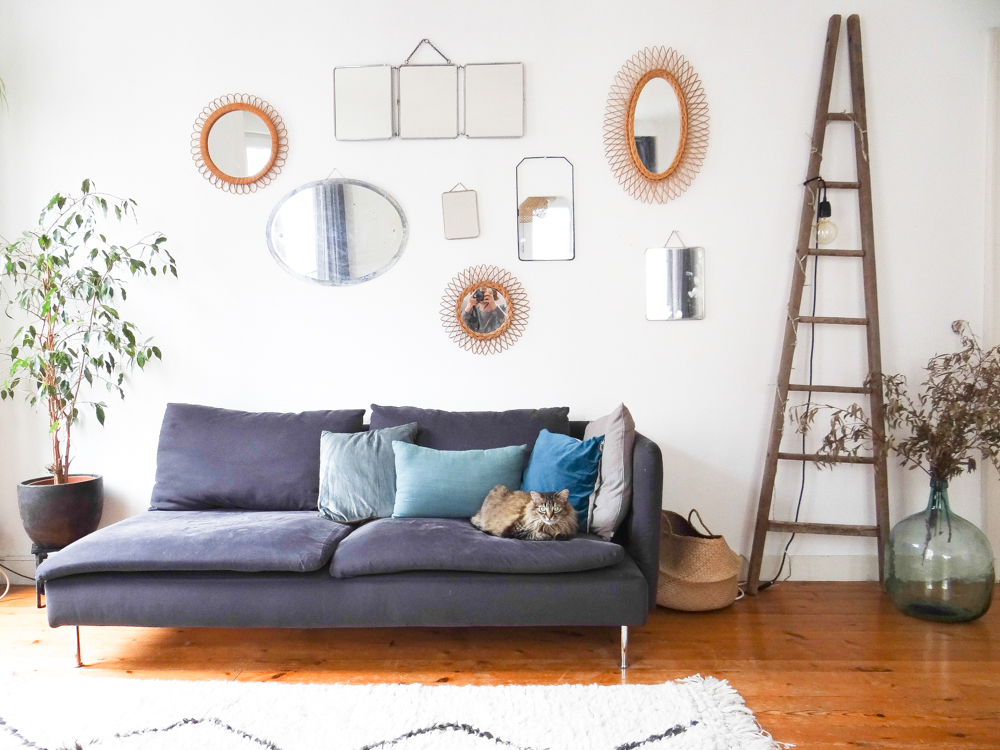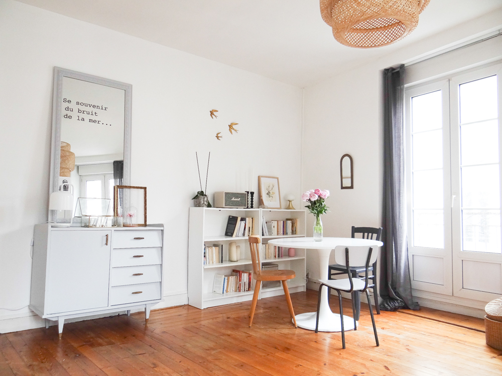 Je vous avais déjà emmené dans le salon il y a quelques temps, il y a eu quelques changements depuis. Le mur de miroirs s’est étoffé, j’ai fabriqué une baladeuse pour l’échelle, j’ai ajouté quelques plantes et objets, changé les coussins, et twisté ma table de salle à manger au style campagne chic pour quelque chose de plus pop (la table Eero Saarinen de mes rêves n’étant pas pour demain, j’ai trouvé celle-ci qui en a un petit air). J’ai ajouté une bibliothèque sur le mur derrière, qui préfigure un meuble sur mesure que j’aimerais construire. En attendant, les Billy font le job à moindre coût. La déco de la pièce à vivre reste un mélange de meubles et objets achetés mais surtout chinés, mais j’avoue que j’apprécie de plus en plus les touches plus modernes dans les déco chinées, les uns mettant en avant les autres. En termes de couleurs, j’aime bien découvrir des intérieurs immaculés d’où rien ne dépasse, mais ce n’est pas pour moi au quotidien et j’ai aussi besoin d’un peu de vie dans ma maison. J’ai donc opté pour un compromis qui me ressemble, quelque chose de plus vivant, mais qui reste doux et dans des couleurs neutres. Et puis j’avais envie de mettre en valeur le volume de la pièce, avec ses murs blancs, son plafond haut, et ses trois grandes fenêtres, pour lesquels j’avais eu un coup de cœur lors de ma première visite. Le gros chat est inclus dans le package :). Le trio d’hirondelles au mur date des années 60/70 et vient des usa, je les ai longtemps cherché et je les adore, je crois que c’est l’objet qui me ressemble le plus !