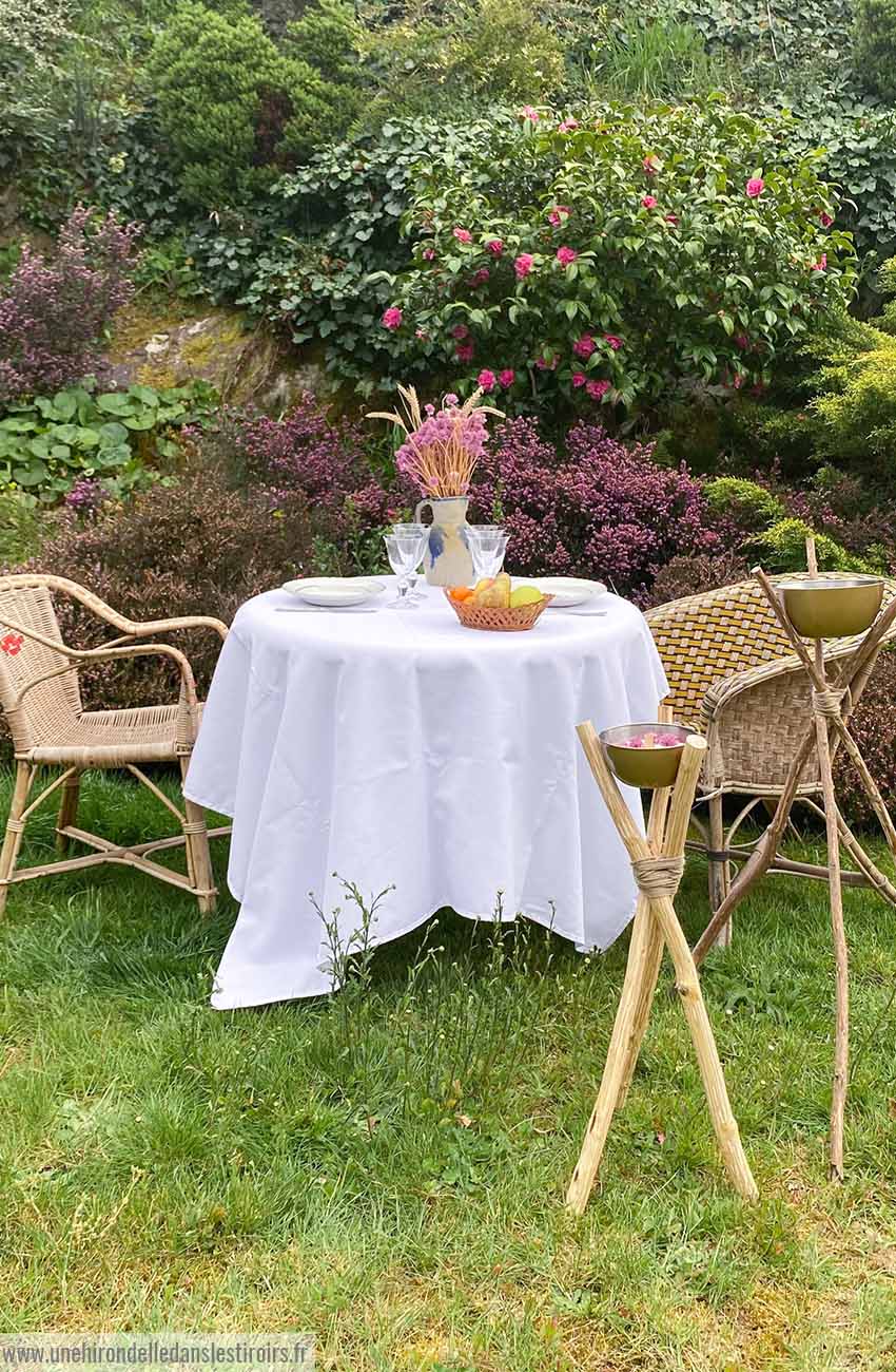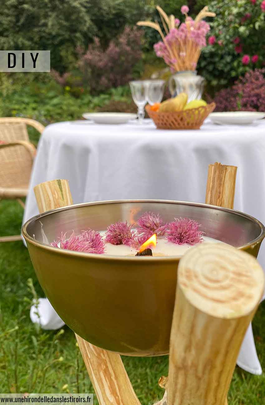 Pour ce DIY bougie d’extérieur, j’ai tout d’abord fabriqué un trépied. Pour cela, j’ai simplement utilisé des branches de bois ramassées dans la nature. Vous pouvez par exemple aussi utiliser les branches issues de la taille du jardin. Je les ai d’abord coupé à la même dimension . J’ai ensuite enlevé l’écorce, et je les ai fixé entre elles en recouvrant le tout d’une ficelle en matière naturelle. Pour la contenant de la bougie, j’ai opté pour des bols en métal que j’ai peint à la bombe. Mais vous pouvez utiliser des bols en bois, ou même en céramique. L’essentiel est que le contenant soit rond et évasé afin de pouvoir se placer facilement dans le trépied en étant bien maintenu ! Il suffit ensuite de couler une bougie à l’intérieur. De la cire, des mèches en bois (parce que j’adore leur crépitement), quelques fleurs séchées, et le tour est joué !