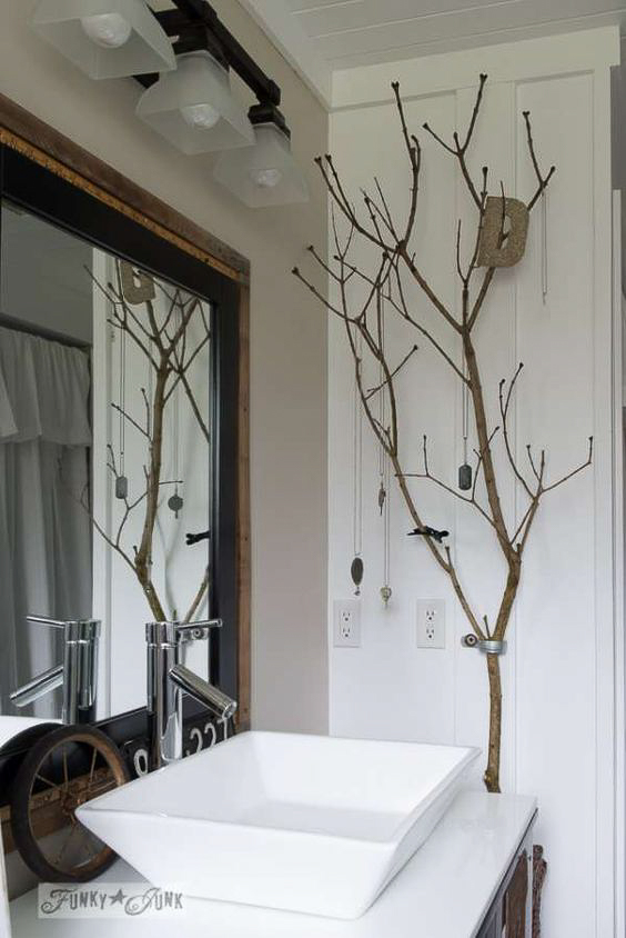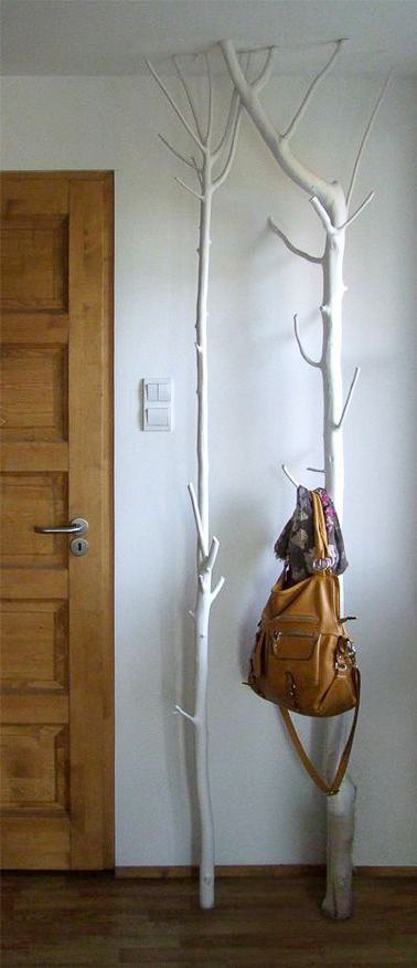 Pourquoi ne pas utiliser une branche d’arbre pour créer un porte-manteau ? Si vous disposez d’une grande branche avec plusieurs fourches, il ne vous reste plus qu’à l’installer entre le sol et le plafond. A l’horizontale, la branche d’arbre devient une patère murale.